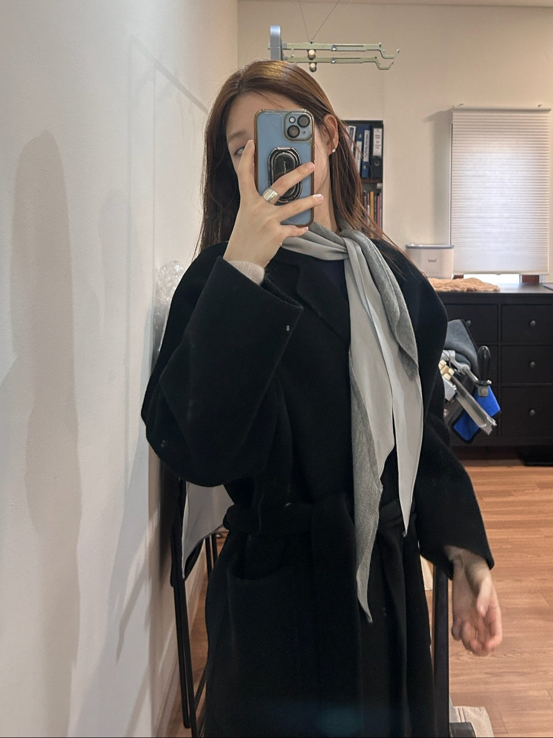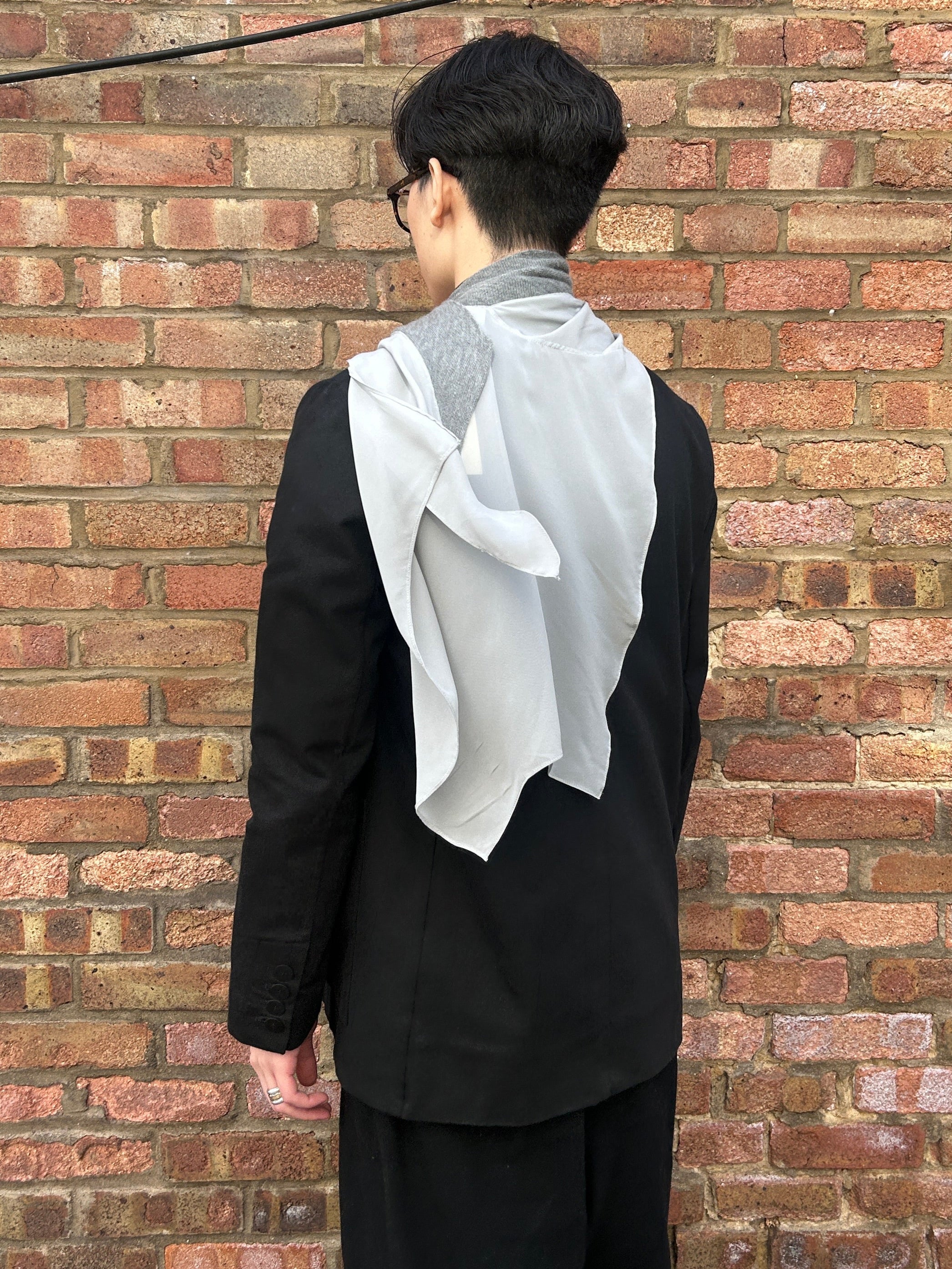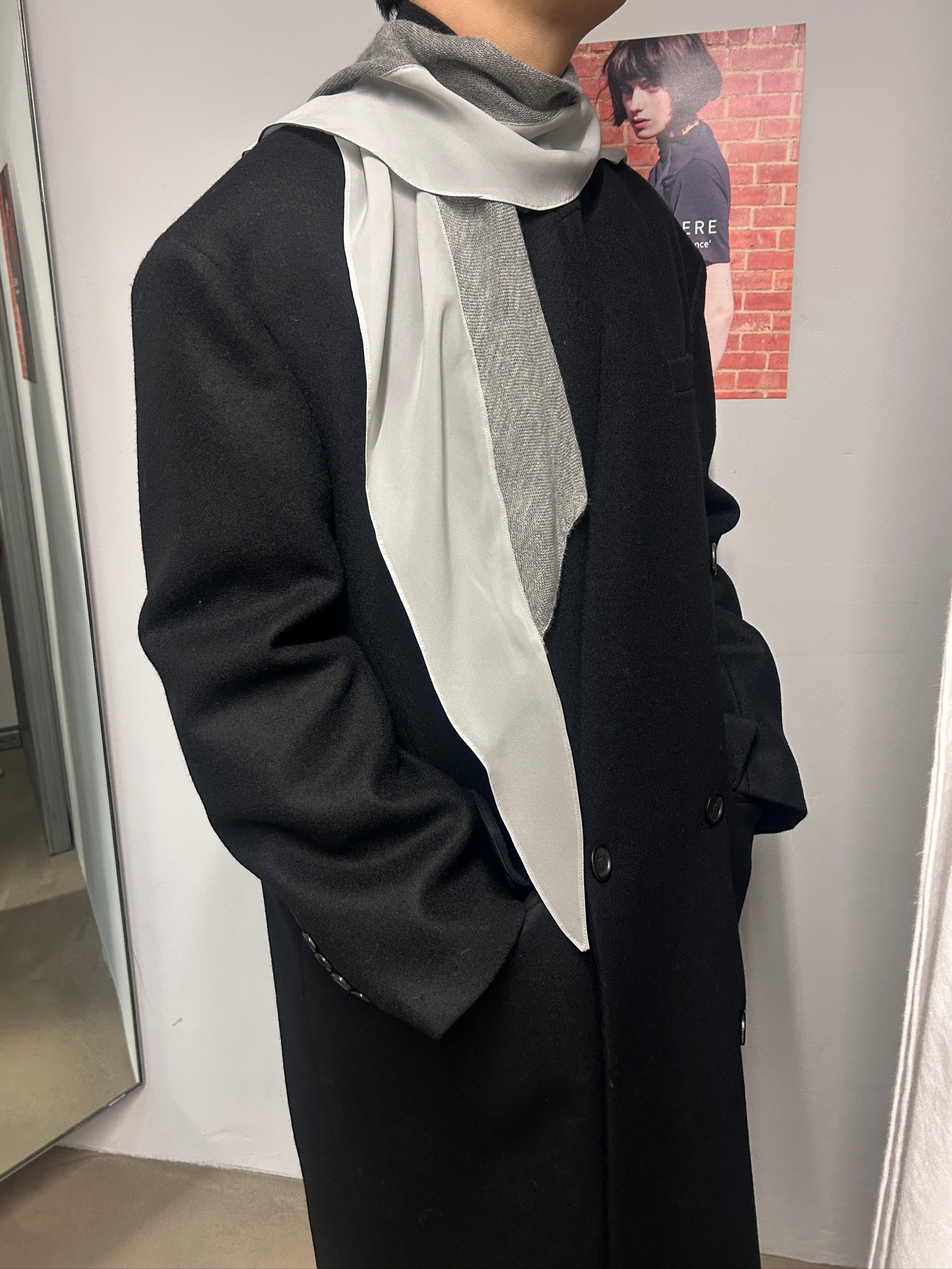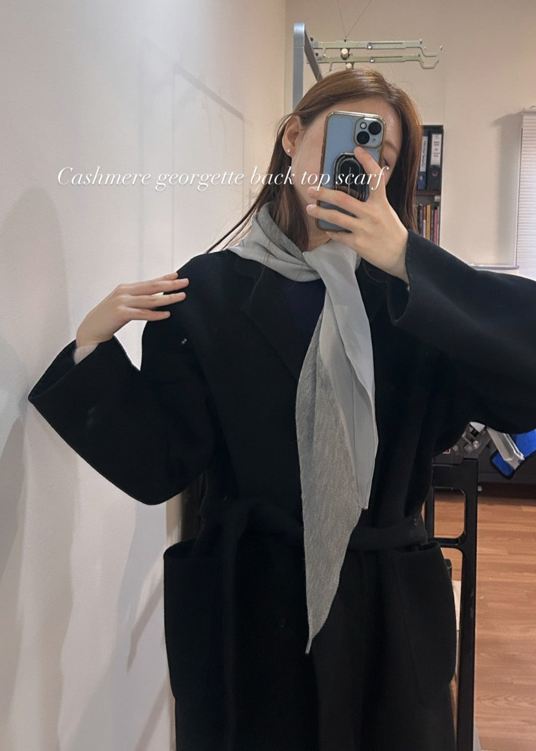 This scarf beautifully combines the warmth of cashmere with the airy elegance of silk georgette. The part that touches the neck is made of 100% cashmere knit, providing exceptional softness and insulation, while the flowing drapes are crafted from 100% silk georgette, offering a light and graceful silhouette. With a minimal yet refined design, this scarf serves as a sophisticated accent to your outfit from transitional seasons into winter. Watery grey colour palette with a sense of warm elegance. It can be layered on any top and outer.