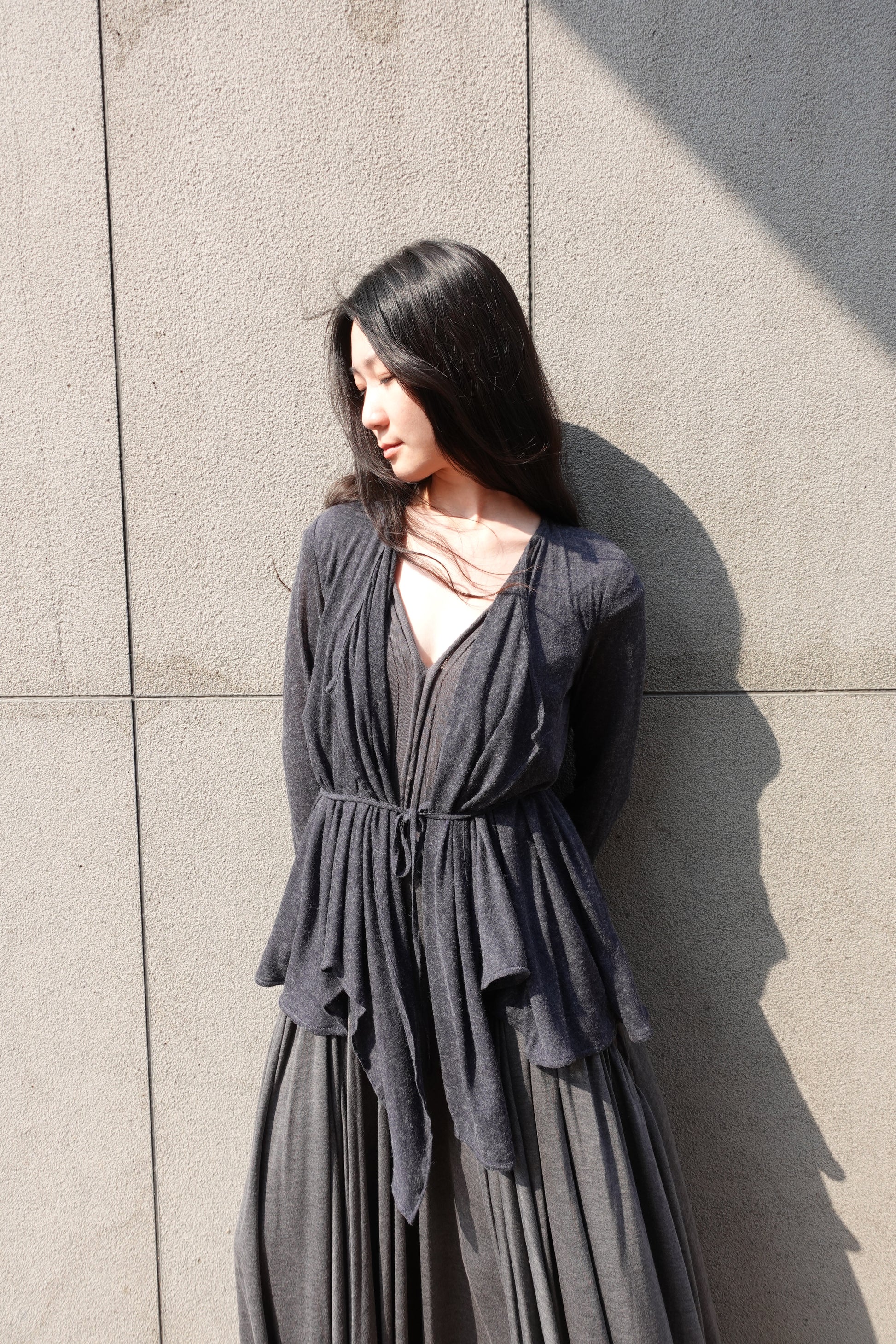 여밈이 없는 디자인이며 허리의 스트랩 디테일을 통해 다양한 실루엣 연출이 가능합니다. 사이드 포켓이 더해져 실용성을 높였으며, 비대칭 헴라인은 다양한 바텀이나 드레스와 자연스럽게 스타일링됩니다. 전체적인 실루엣에 자연스러운 드레이프를 더하며, 간절기에는 단독 아우터로, 겨울에는 이너로 레이어드할 수 있도록 디자인되었습니다.
