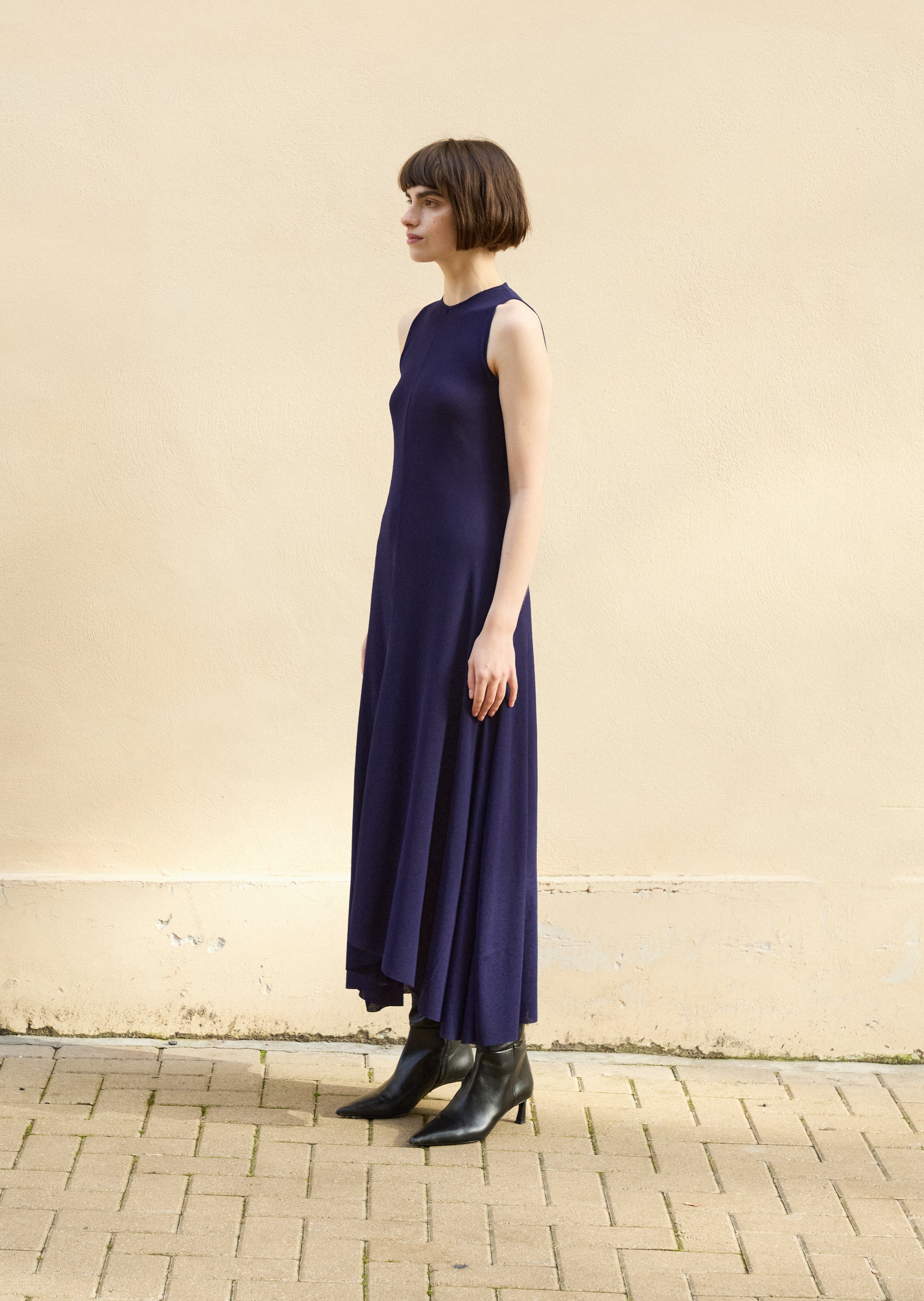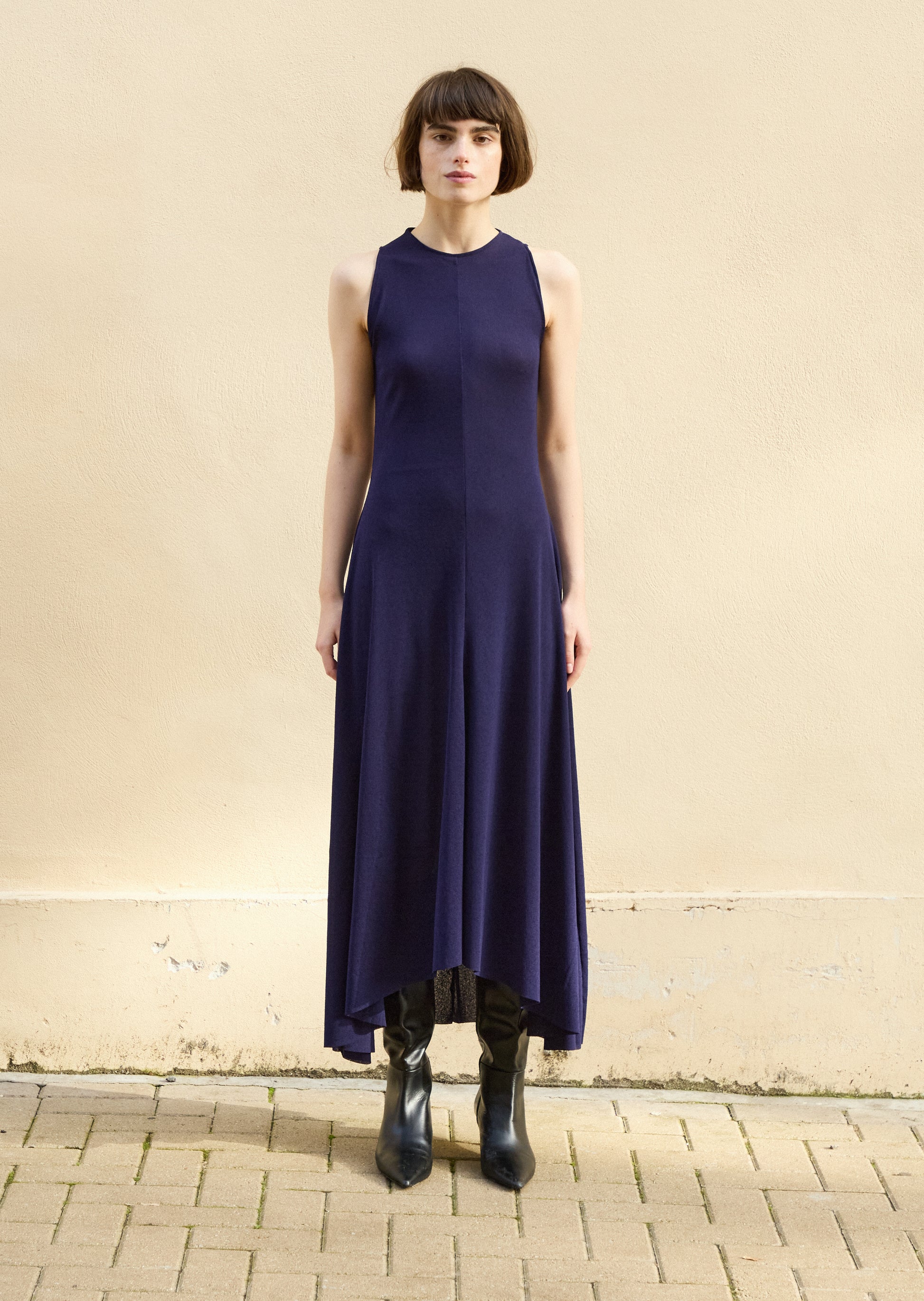 This sleeveless dress is suitable for layering with an inner top in Autumn and wearing alone in Summer. The main fabric is a dry touch rib from Japan, which goes down and spreads to create a flare. You can enjoy different styles in four seasons.