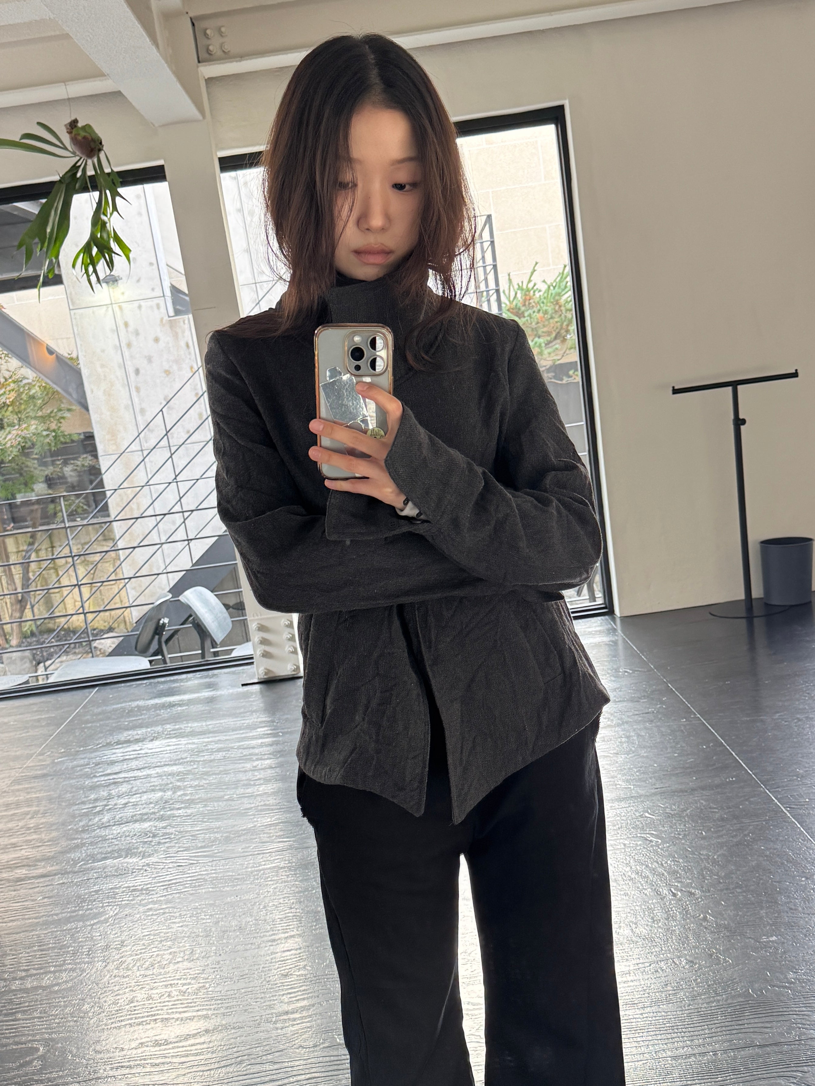 주름 가공이 더해진 울 원단의 빈티지한 표면감과 몸에 슬림하게 밀착되는 실루엣은, Laumière가 추구하는 ‘부시시한 우아함’을 가장 잘 드러내는 아우터 디자인입니다. 함께 스타일링한 Structure 001 팬츠와의 조합을 추천드립니다.