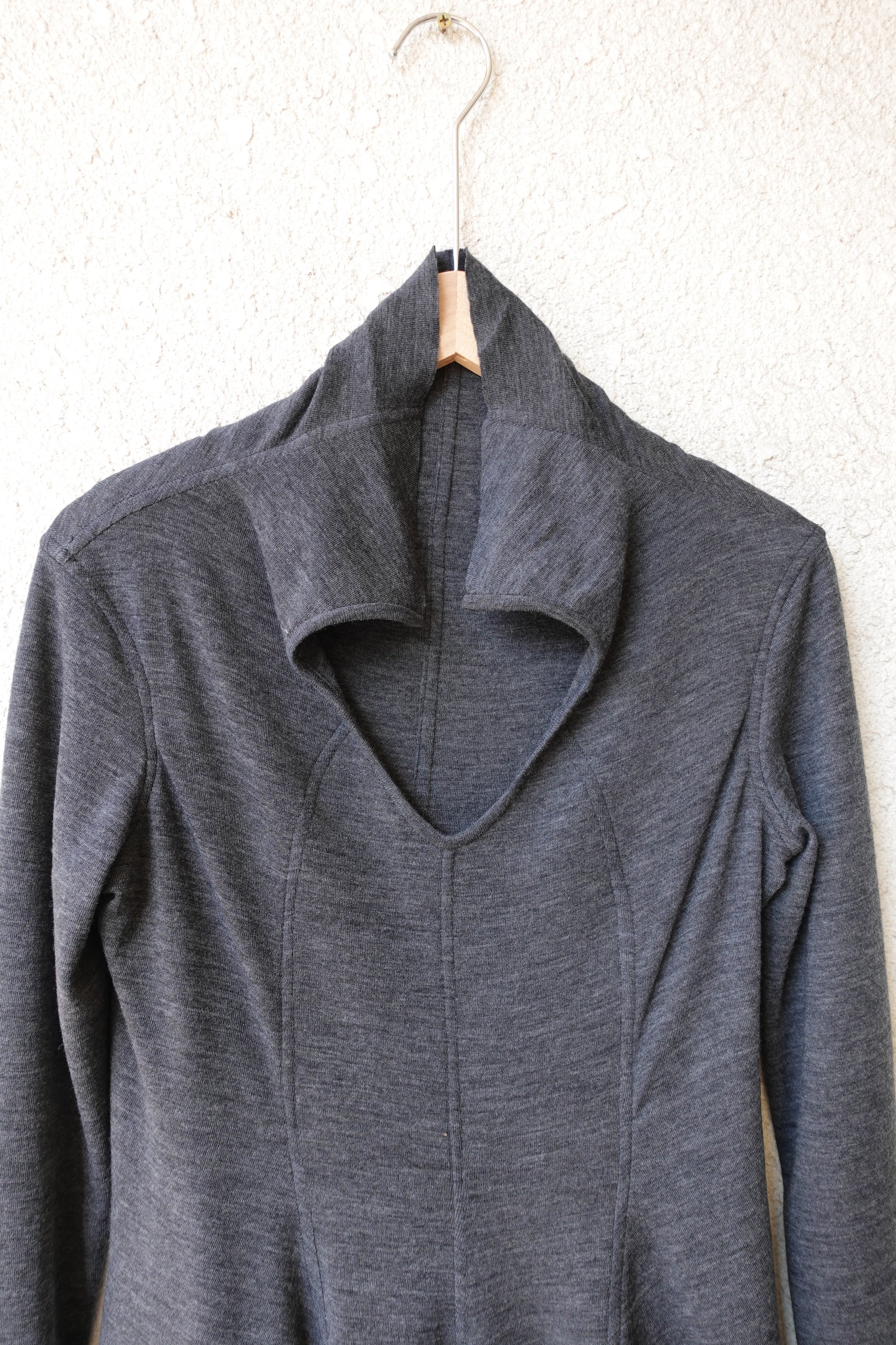 조각적인 곡선의 컷아웃 디테일이 있는 독특한 네크라인의 긴팔 저지 탑 입니다.