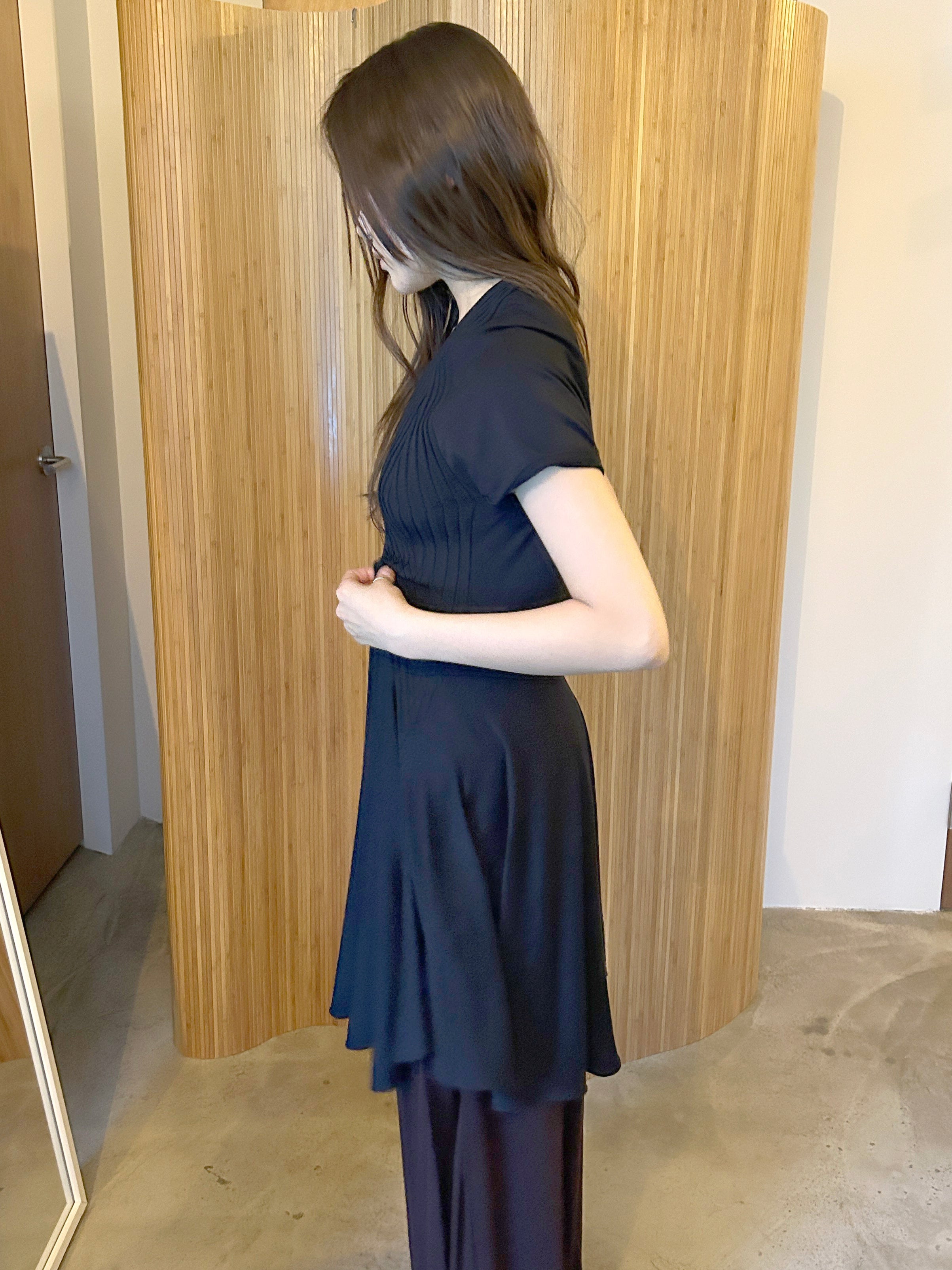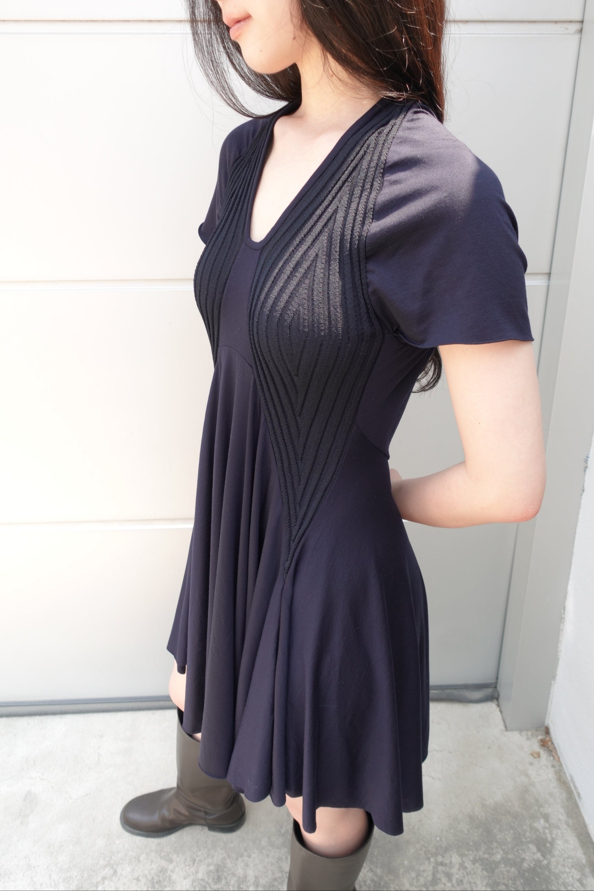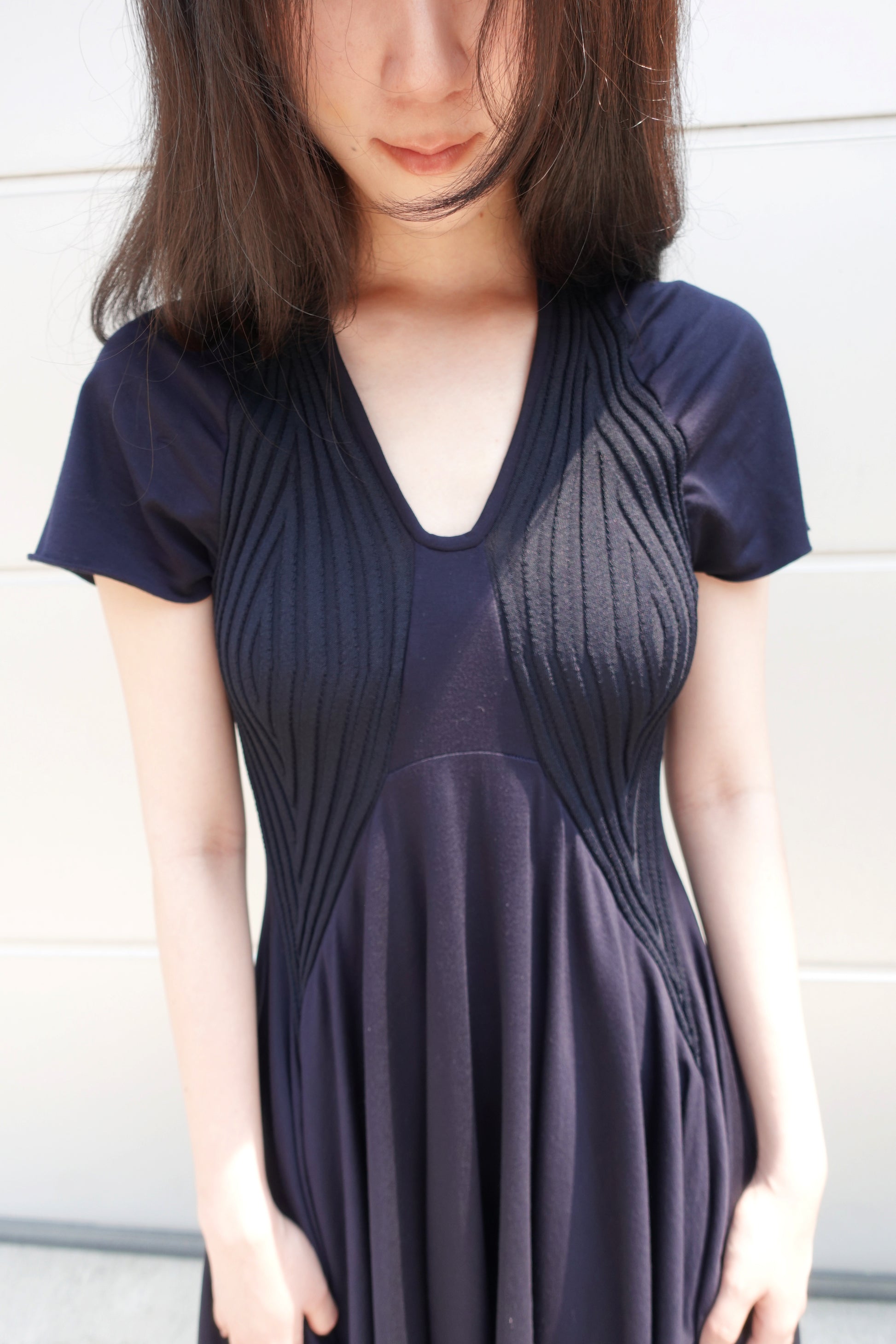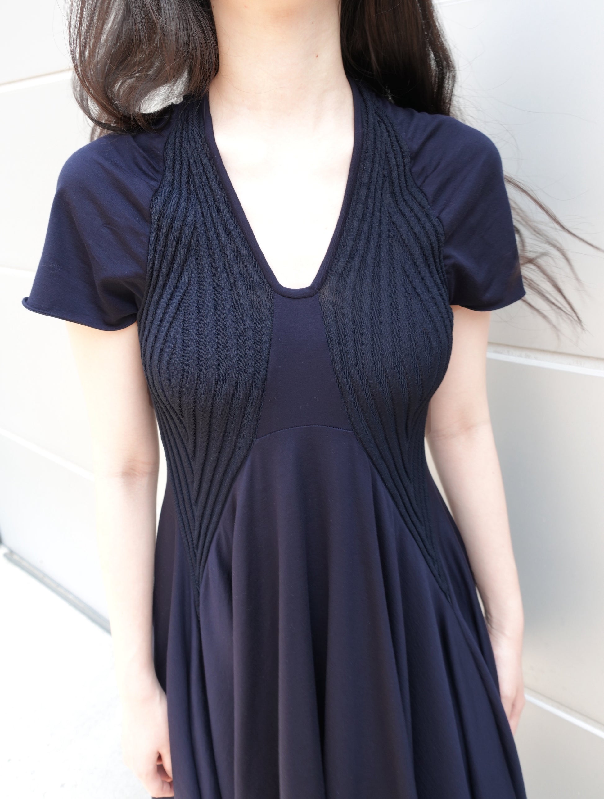 리브 조직 니트와 유연한 저지 패널을 조합해 제작된 반소매 드레스입니다. 텍스처가 대비되는 슬림한 상체 실루엣과 자연스럽게 흐르는 플레어 스커트로 구성되어 있으며, 자연스러운 움직임과 부드러운 구조감을 강조합니다. 깔끔한 U넥 라인과 가벼운 밑단 실루엣을 위하여 컷팅 생지 마감으로 완성하였습니다.