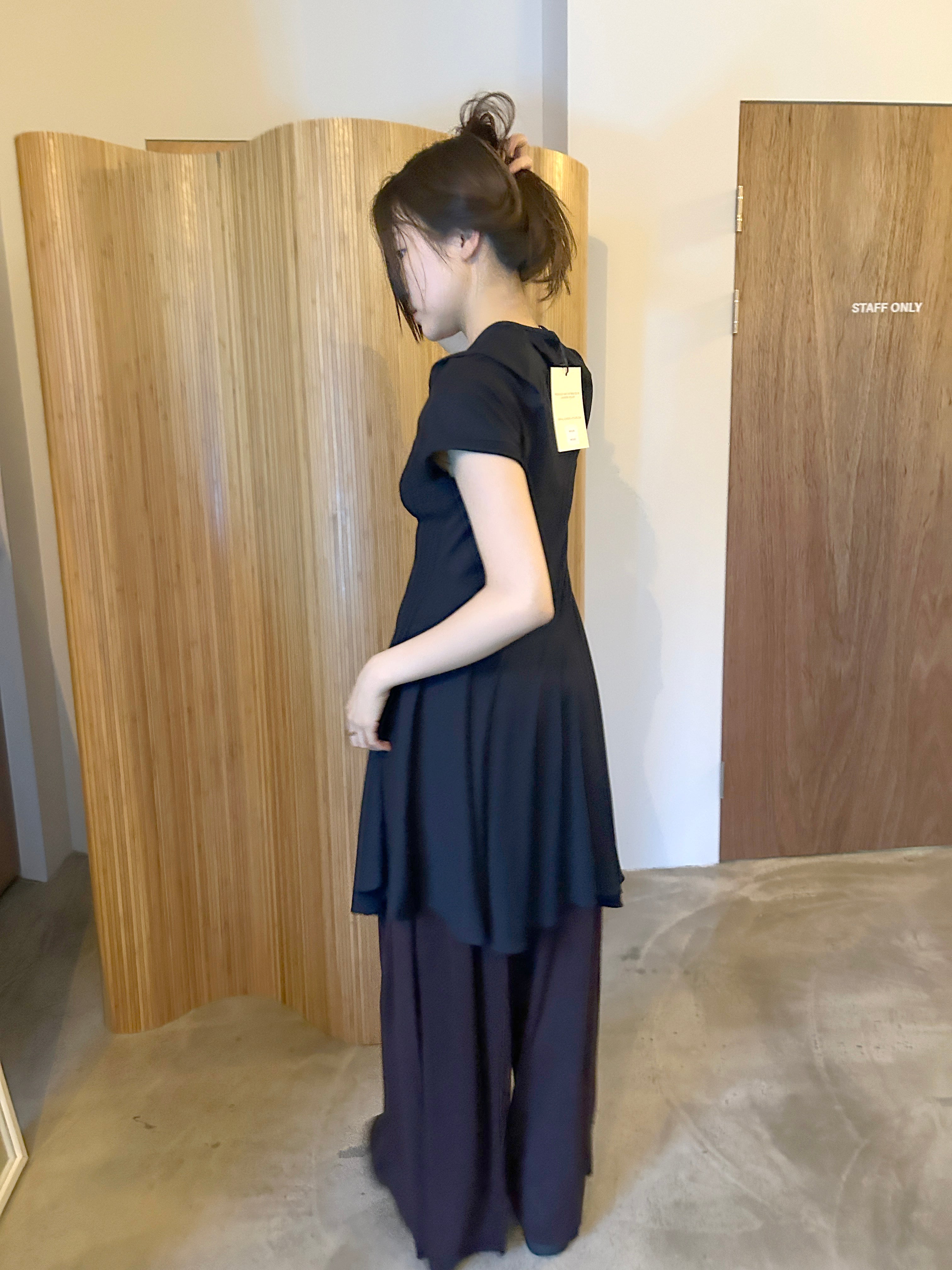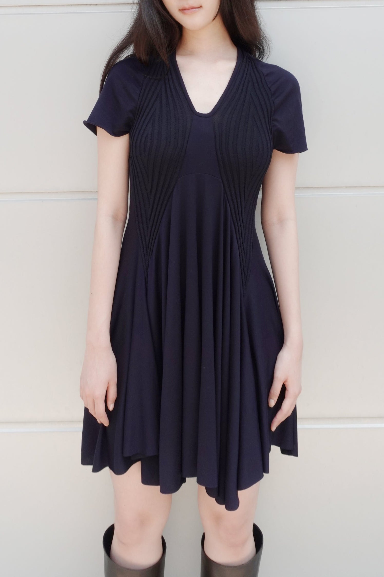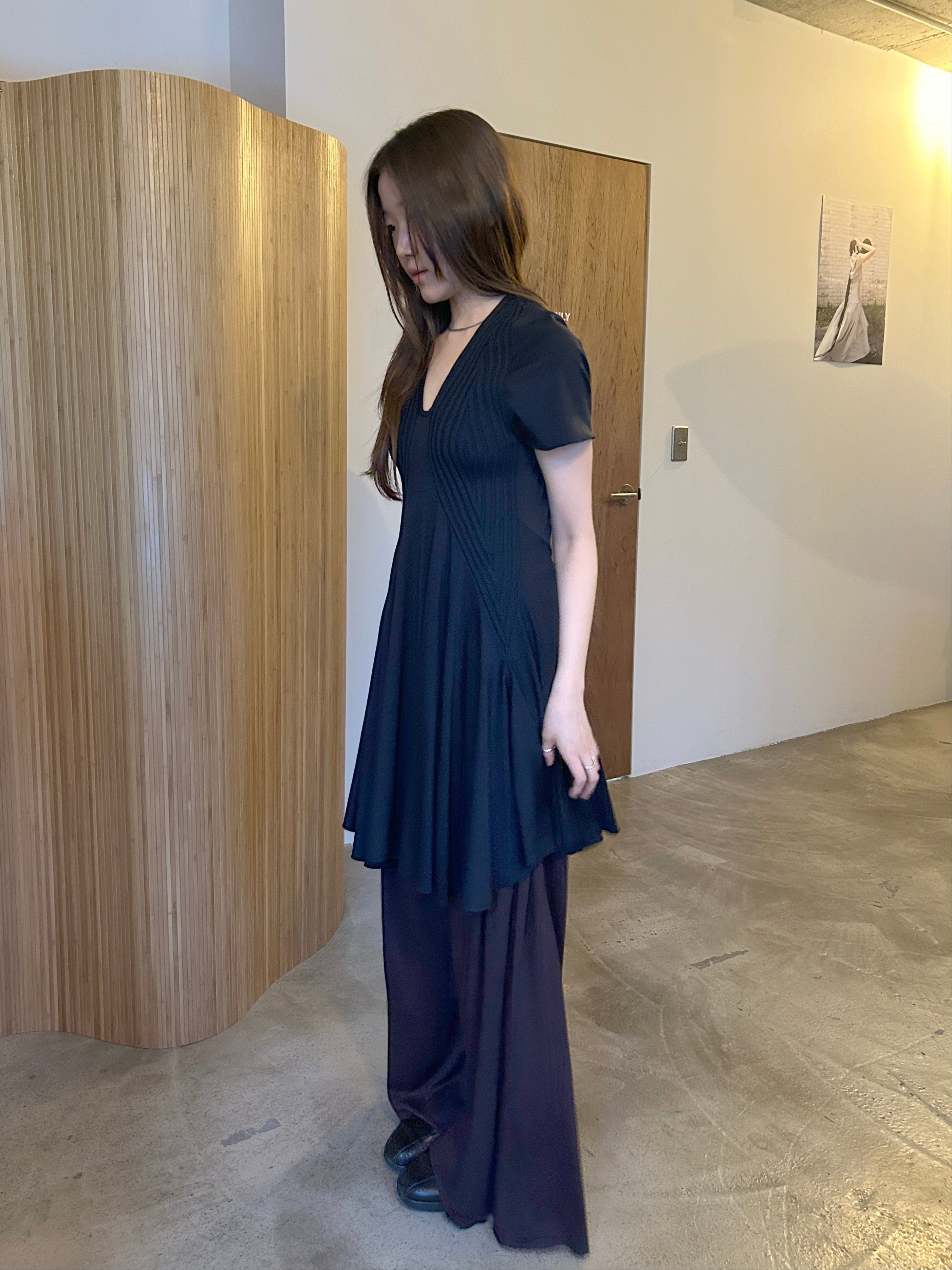 리브 조직 니트와 유연한 저지 패널을 조합해 제작된 반소매 드레스입니다. 텍스처가 대비되는 슬림한 상체 실루엣과 자연스럽게 흐르는 플레어 스커트로 구성되어 있으며, 자연스러운 움직임과 부드러운 구조감을 강조합니다. 깔끔한 U넥 라인과 가벼운 밑단 실루엣을 위하여 컷팅 생지 마감으로 완성하였습니다.