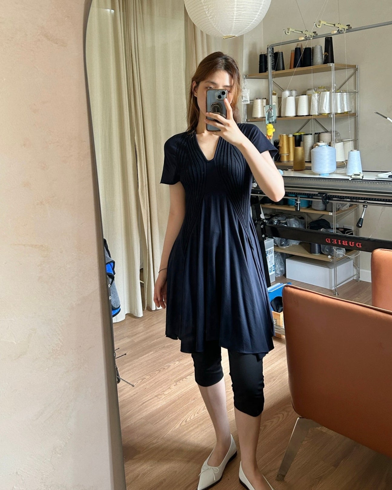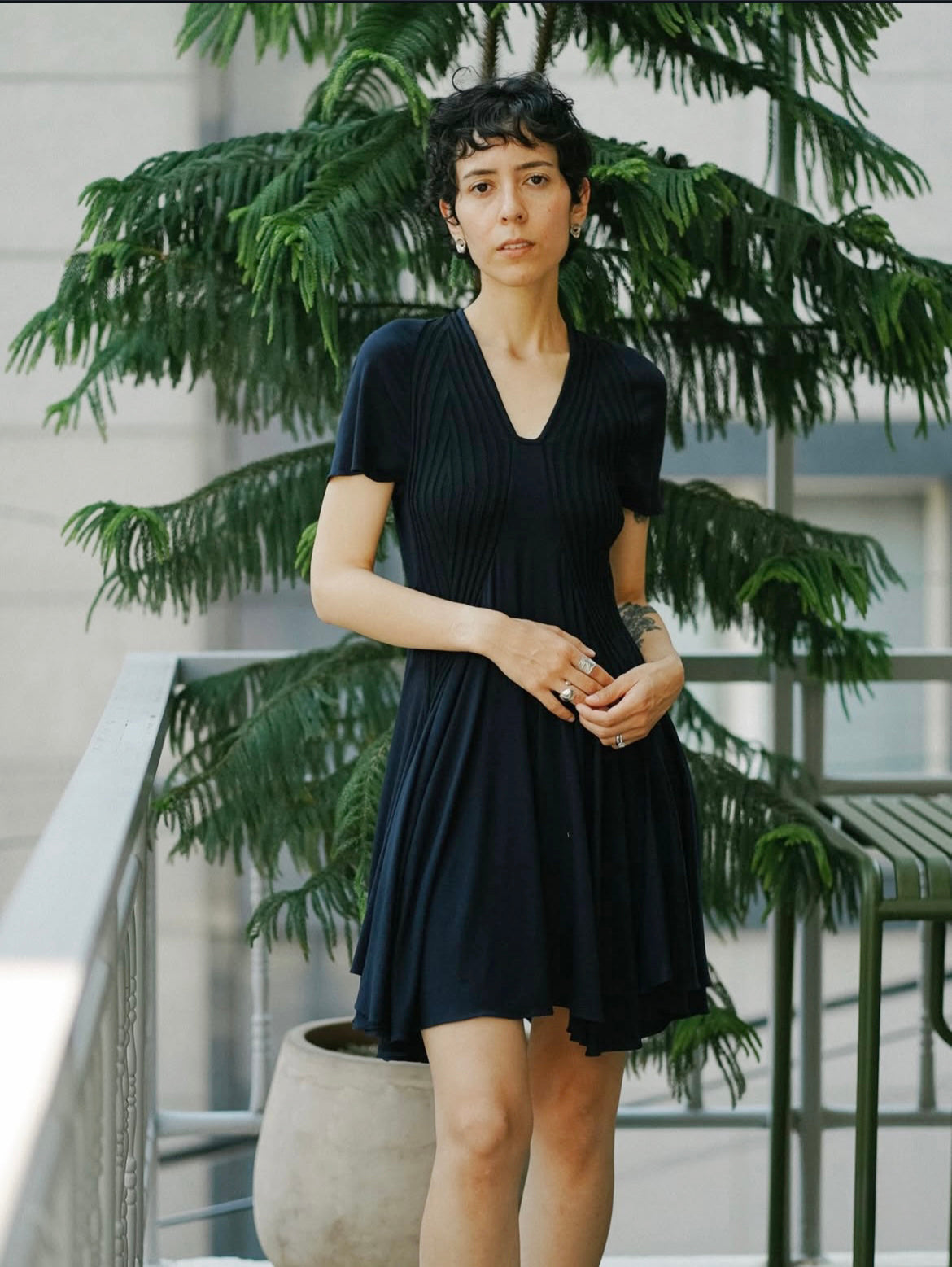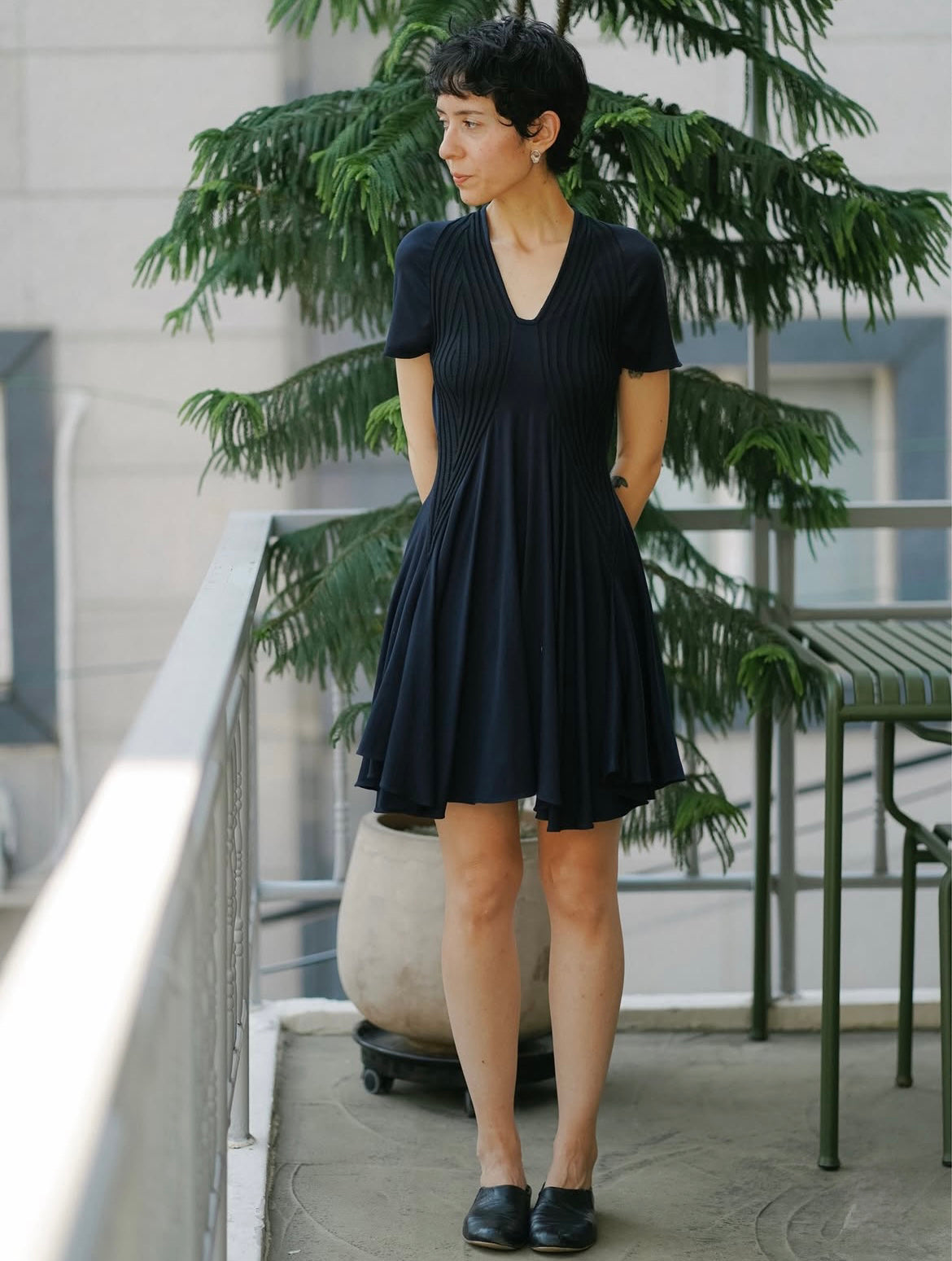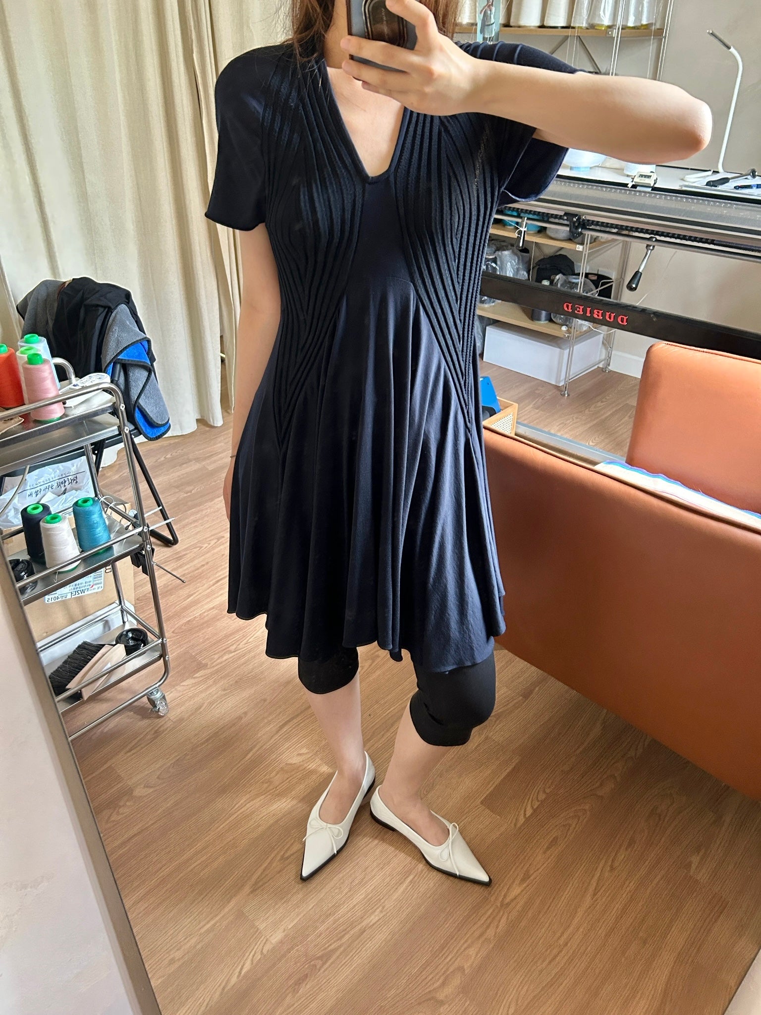 리브 조직 니트와 유연한 저지 패널을 조합해 제작된 반소매 드레스입니다. 텍스처가 대비되는 슬림한 상체 실루엣과 자연스럽게 흐르는 플레어 스커트로 구성되어 있으며, 자연스러운 움직임과 부드러운 구조감을 강조합니다. 깔끔한 U넥 라인과 가벼운 밑단 실루엣을 위하여 컷팅 생지 마감으로 완성하였습니다.