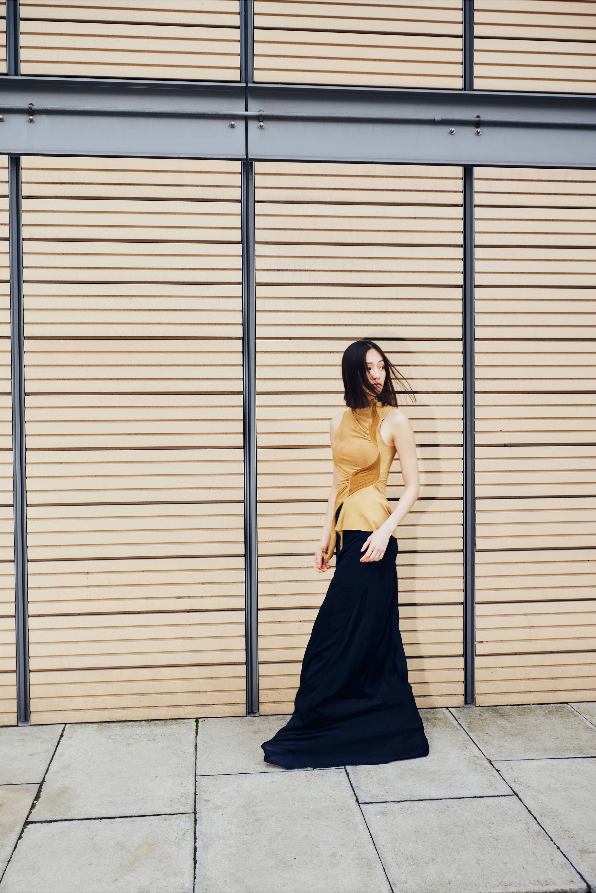 컬렉션 테마인 “Release Tension”은 몸을 조이지 않으면서도 구조적인 형태를 실현하려는 실험에서 출발했으며, 러우미에만의 드레이핑 감각과 긴장감을 풀어낸 라인이 돋보입니다