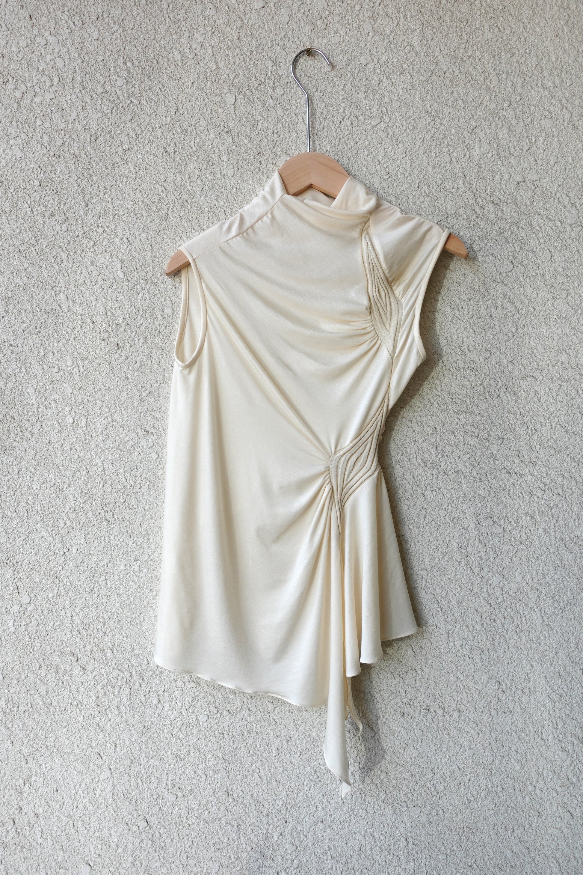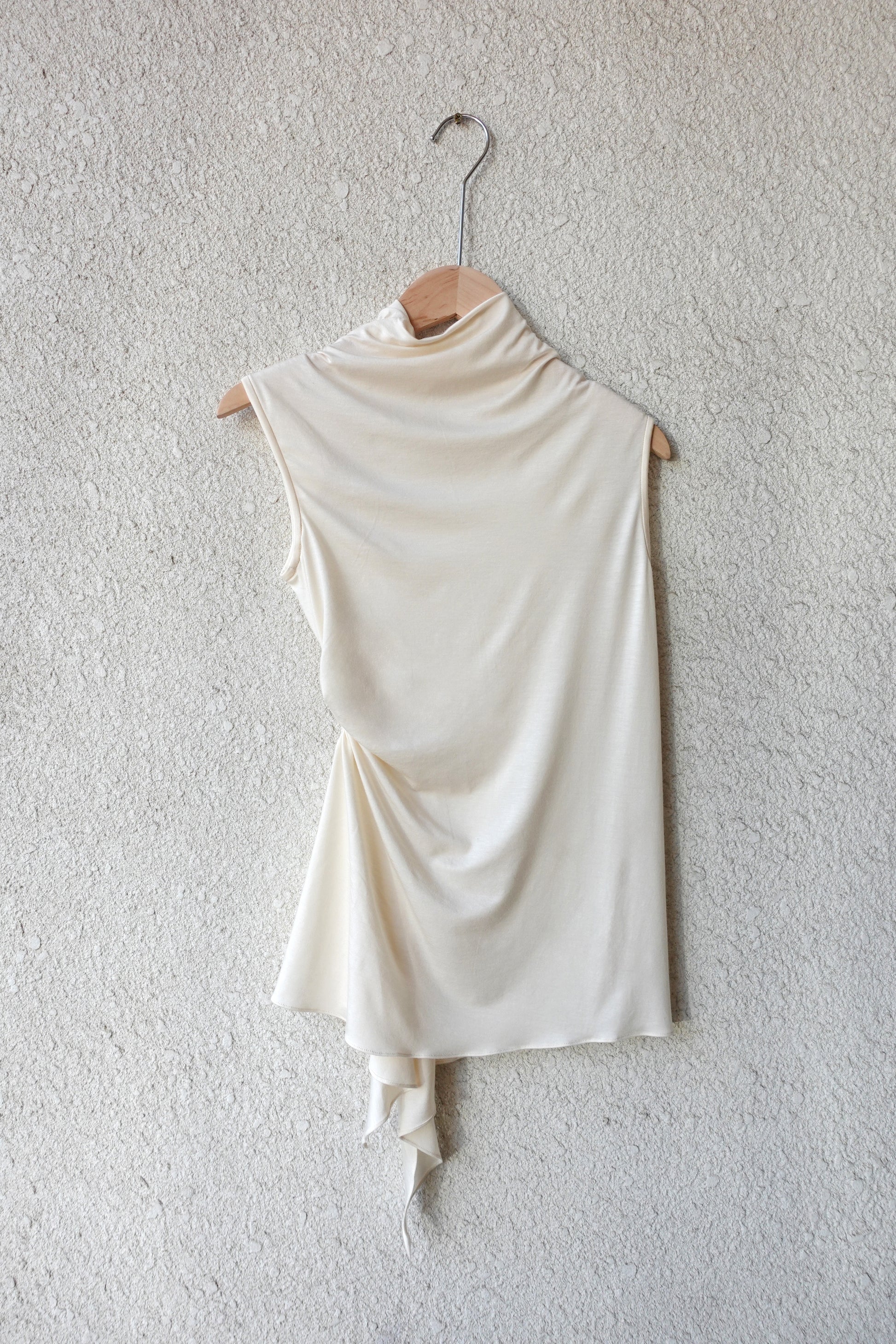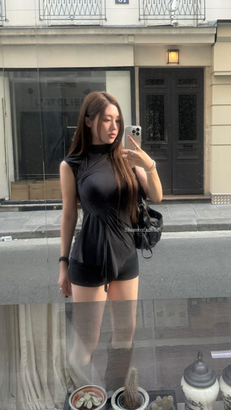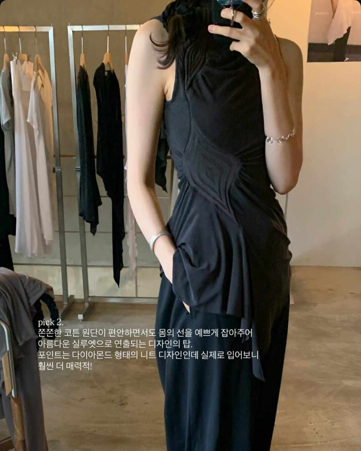 러우미에의 첫 번째 아카이브이자 시그니처인 다이아몬드 니트와 소프트한 비스코스 져지로 구성된 디자인 입니다. 섬세한 라인으로 구성된 소프트한 슬리브리스 탑입니다. 다이아몬드 모양의 리브 니트가 바디 실루엣을 따라 유려하게 흐르며, 함께 봉제된 셔링 디테일이 여성의 몸을 부드럽게 감싸줍니다. 밑단은 비대칭으로 디자인되어 다양한 하의와 자연스럽게 어우러집니다. 하프넥으로 디자인된 네크라인은 라벨이 안쪽으로 들어가게 접어서 연출할 경우 사선 라인의 하프넥으로 연출할 수 있으며, 겉으로 접어 터틀넥 처럼 연출할 경우 로우컷의 마감이 보이며 러프한 느낌의 스타일링이 가능합니다.