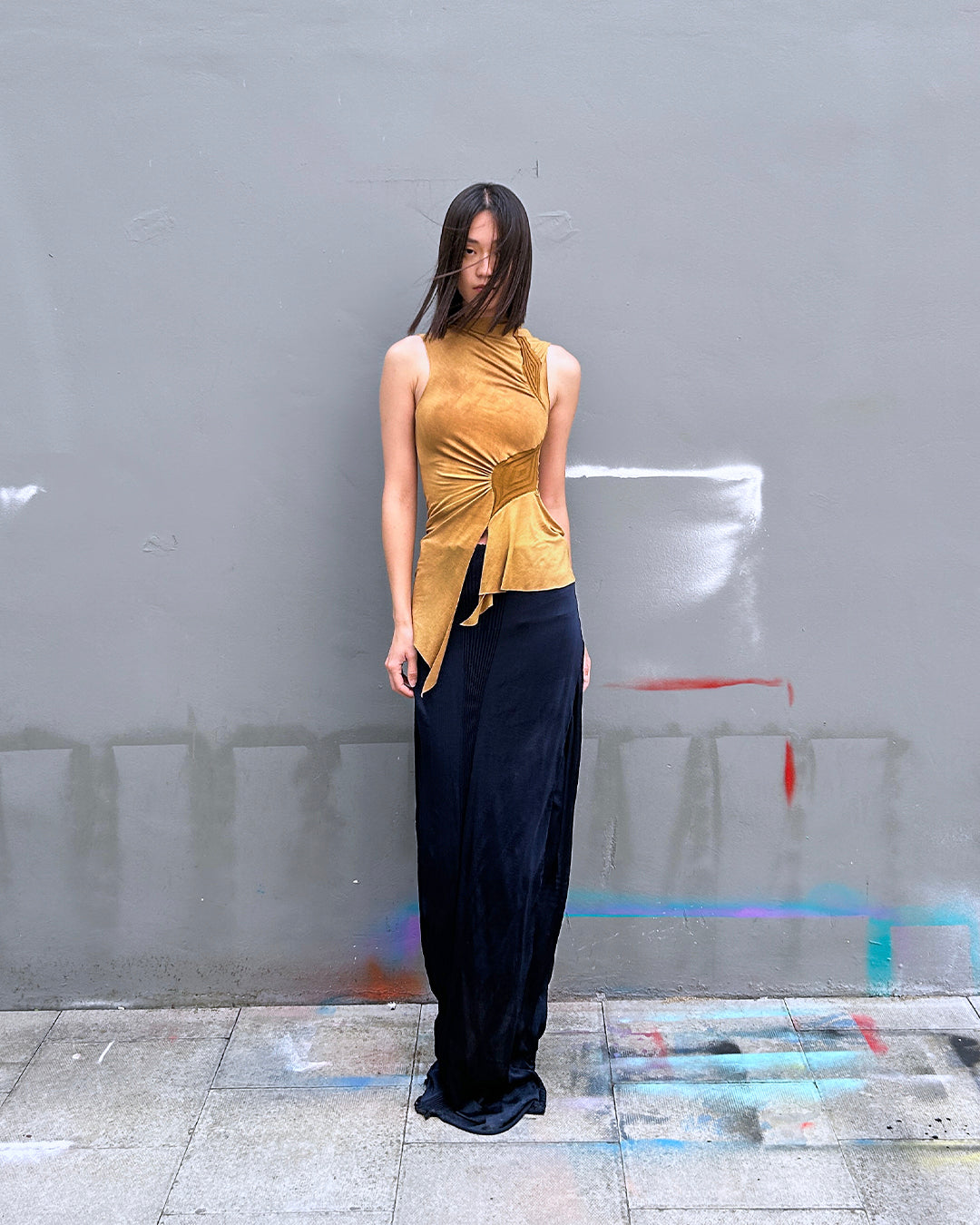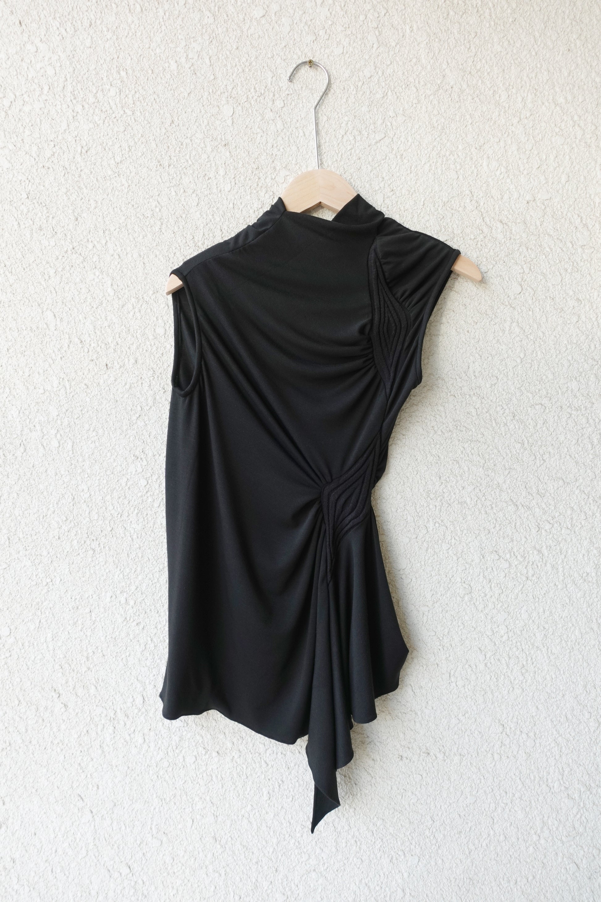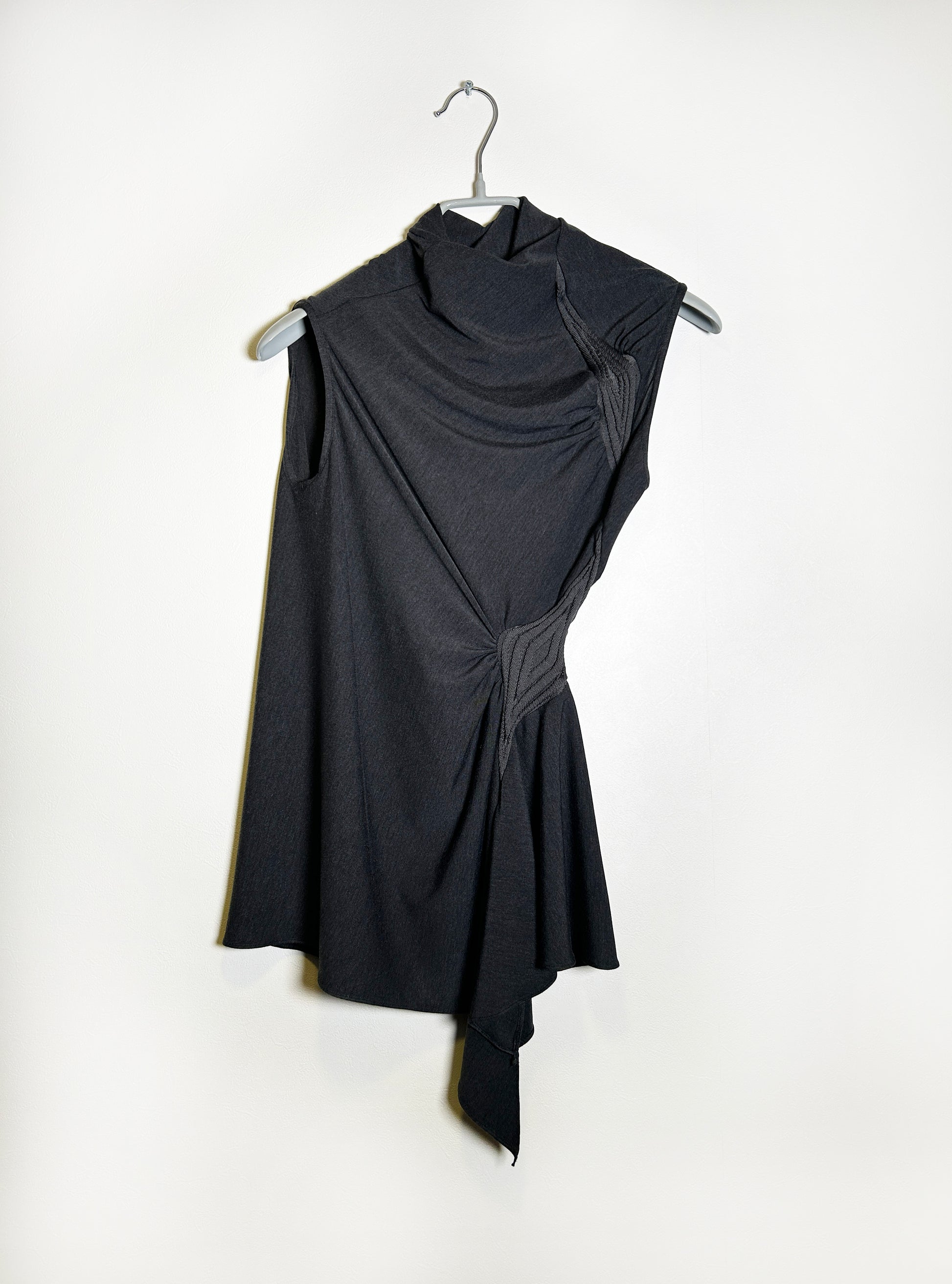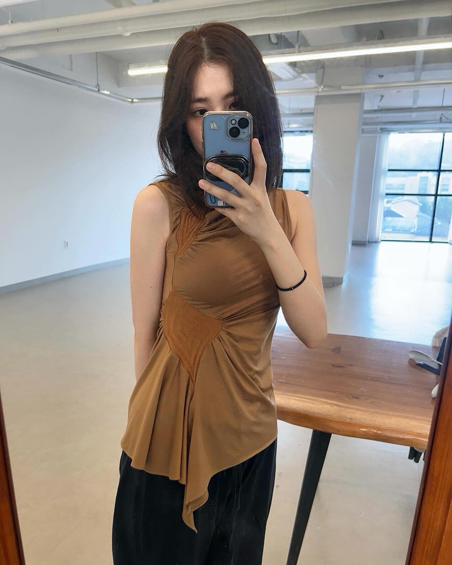 러우미에의 첫 번째 아카이브이자 시그니처인 다이아몬드 니트와 소프트한 비스코스 져지로 구성된 디자인 입니다. 섬세한 라인으로 구성된 소프트한 슬리브리스 탑입니다. 다이아몬드 모양의 리브 니트가 바디 실루엣을 따라 유려하게 흐르며, 함께 봉제된 셔링 디테일이 여성의 몸을 부드럽게 감싸줍니다. 밑단은 비대칭으로 디자인되어 다양한 하의와 자연스럽게 어우러집니다. 하프넥으로 디자인된 네크라인은 라벨이 안쪽으로 들어가게 접어서 연출할 경우 사선 라인의 하프넥으로 연출할 수 있으며, 겉으로 접어 터틀넥 처럼 연출할 경우 로우컷의 마감이 보이며 러프한 느낌의 스타일링이 가능합니다.