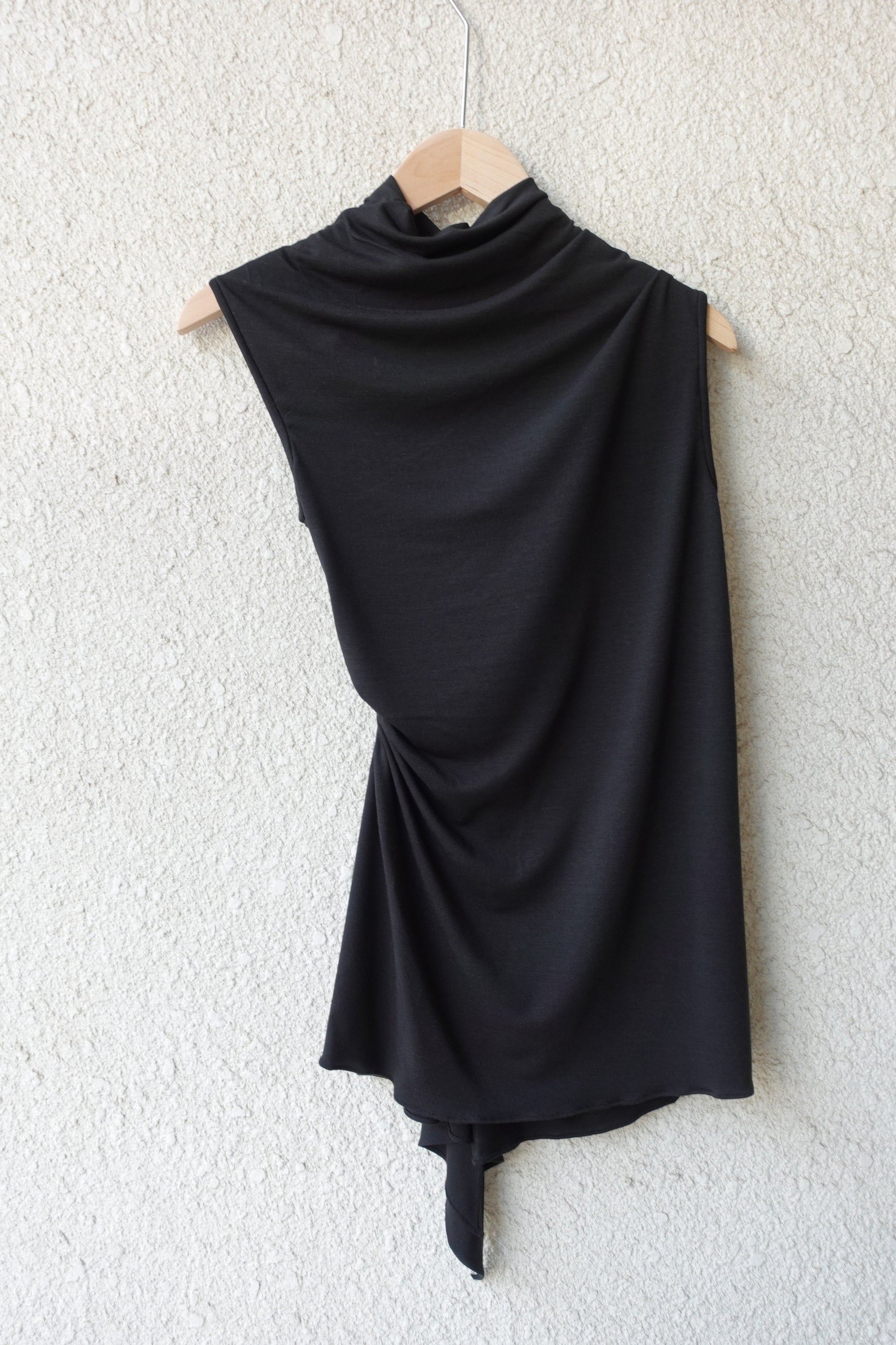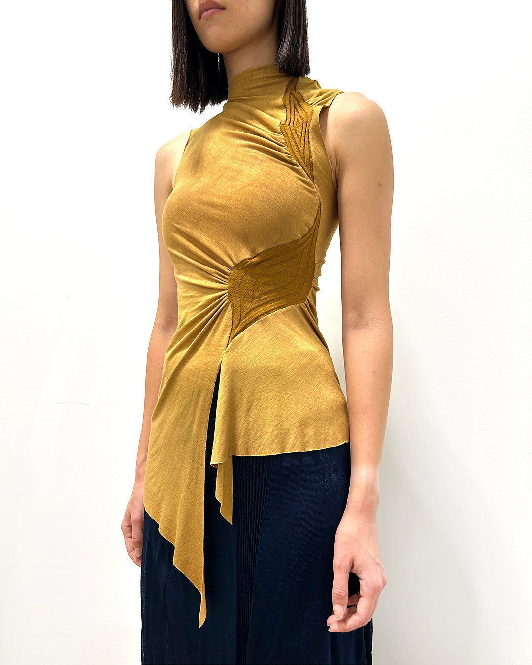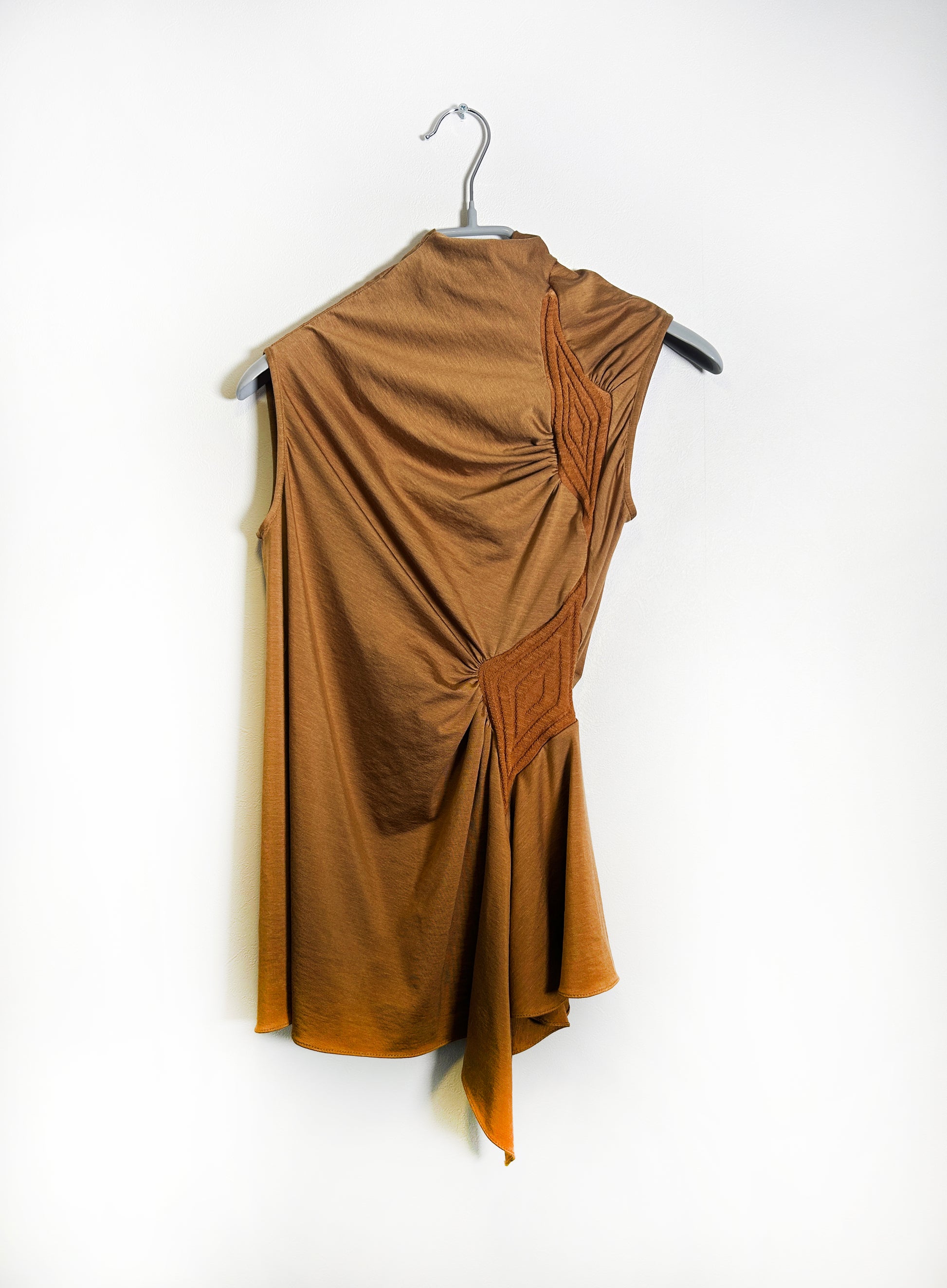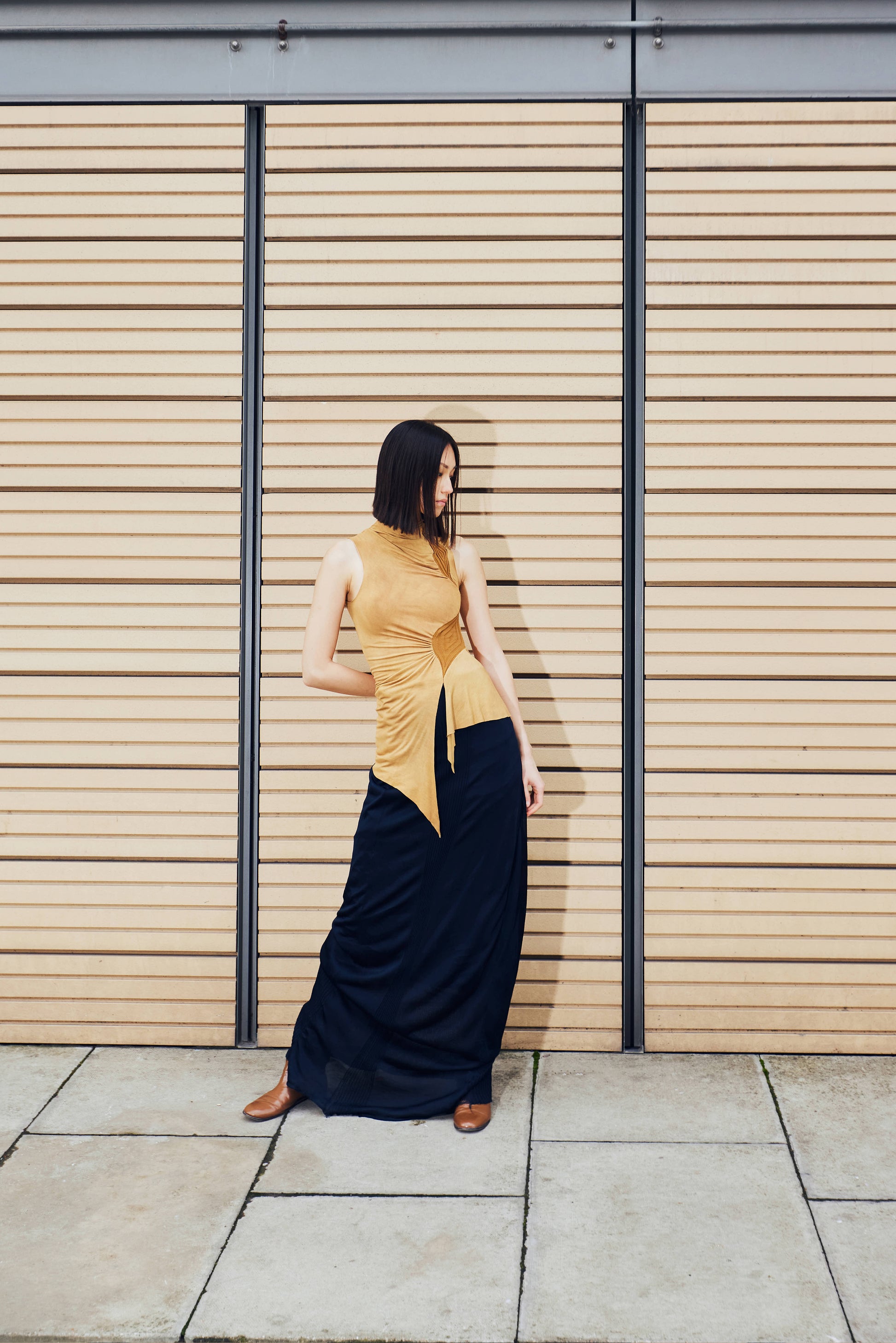 러우미에의 첫 번째 아카이브이자 시그니처인 다이아몬드 니트와 소프트한 비스코스 져지로 구성된 디자인 입니다. 섬세한 라인으로 구성된 소프트한 슬리브리스 탑입니다. 다이아몬드 모양의 리브 니트가 바디 실루엣을 따라 유려하게 흐르며, 함께 봉제된 셔링 디테일이 여성의 몸을 부드럽게 감싸줍니다. 밑단은 비대칭으로 디자인되어 다양한 하의와 자연스럽게 어우러집니다. 하프넥으로 디자인된 네크라인은 라벨이 안쪽으로 들어가게 접어서 연출할 경우 사선 라인의 하프넥으로 연출할 수 있으며, 겉으로 접어 터틀넥 처럼 연출할 경우 로우컷의 마감이 보이며 러프한 느낌의 스타일링이 가능합니다.