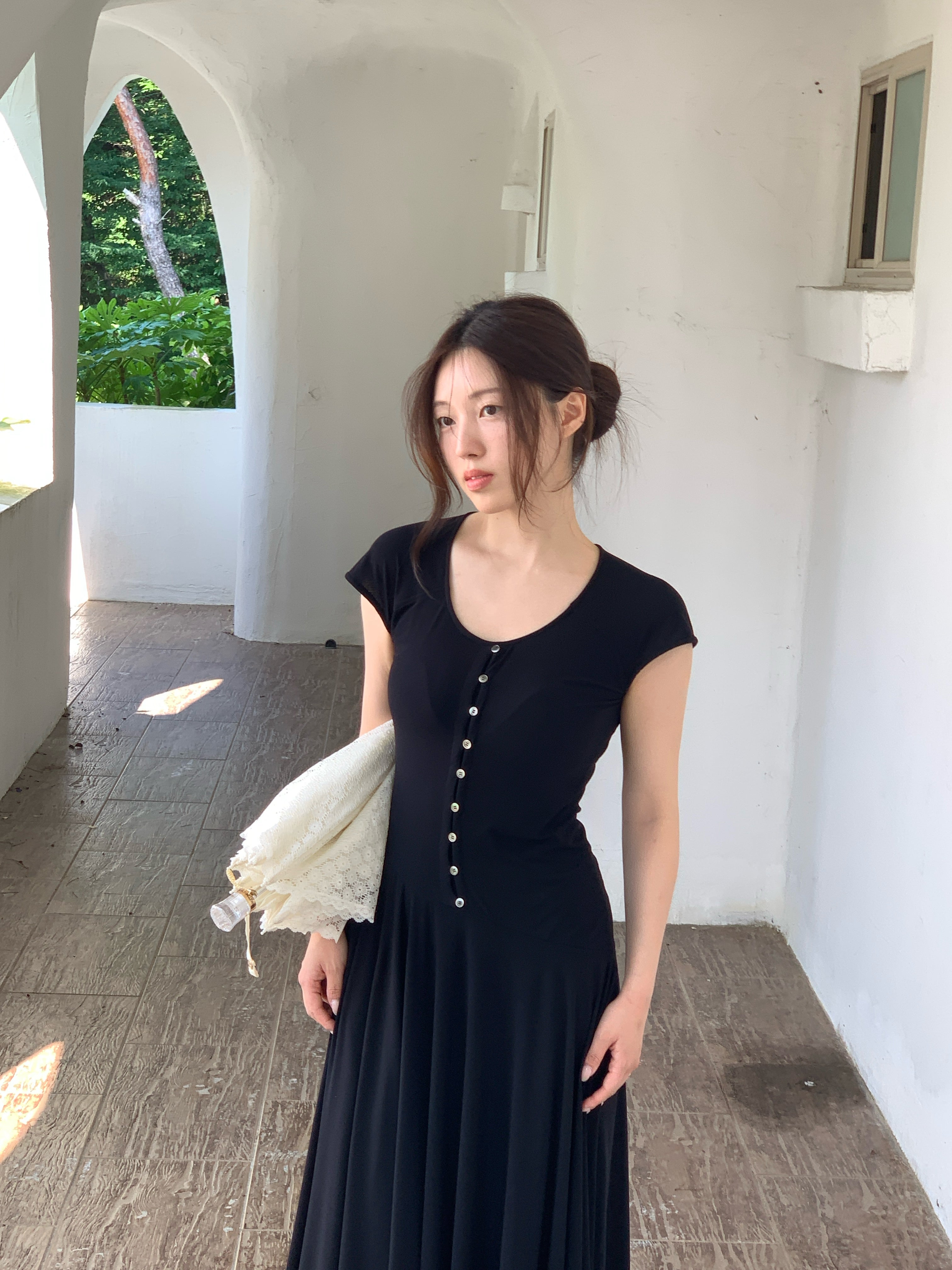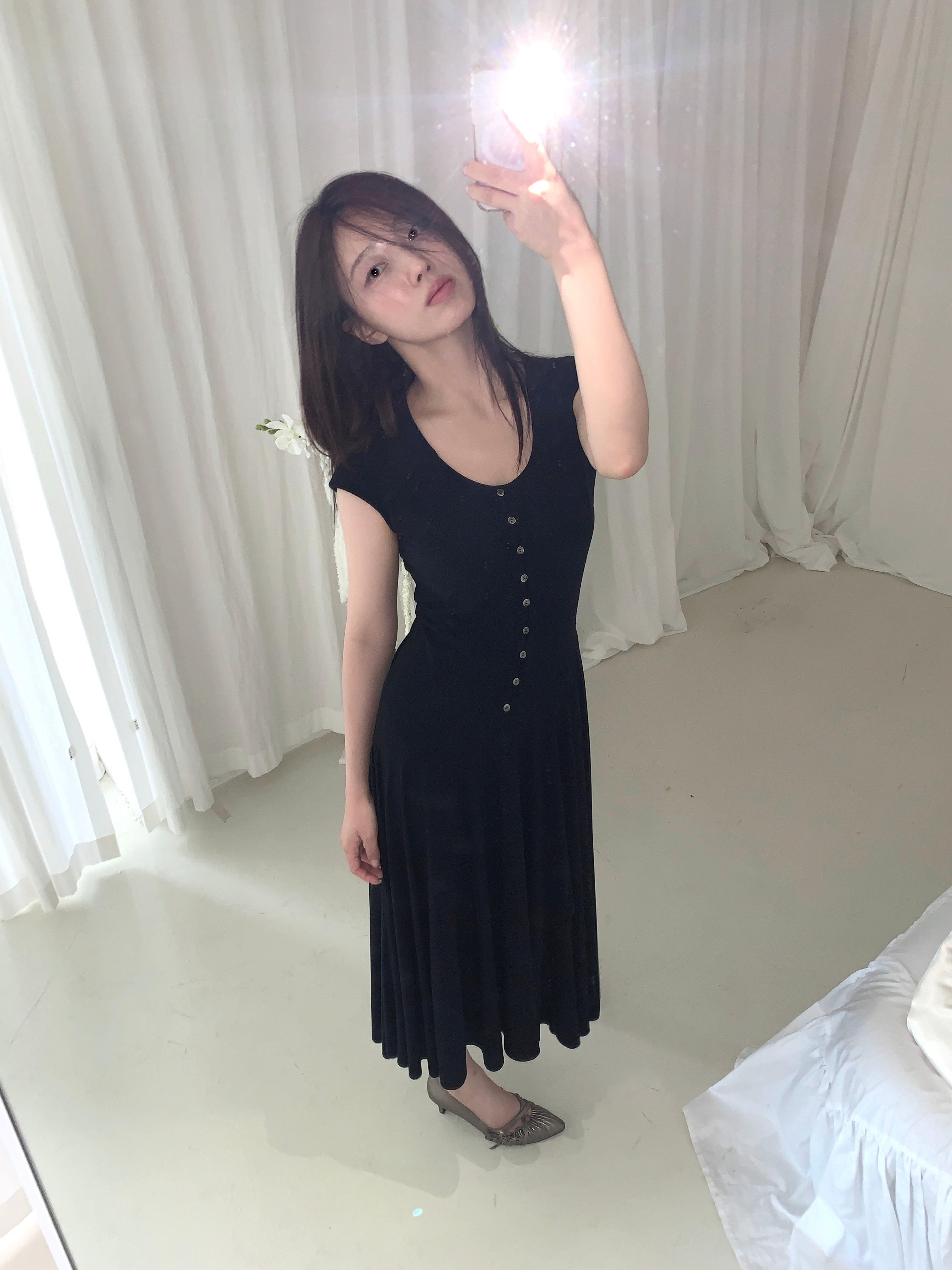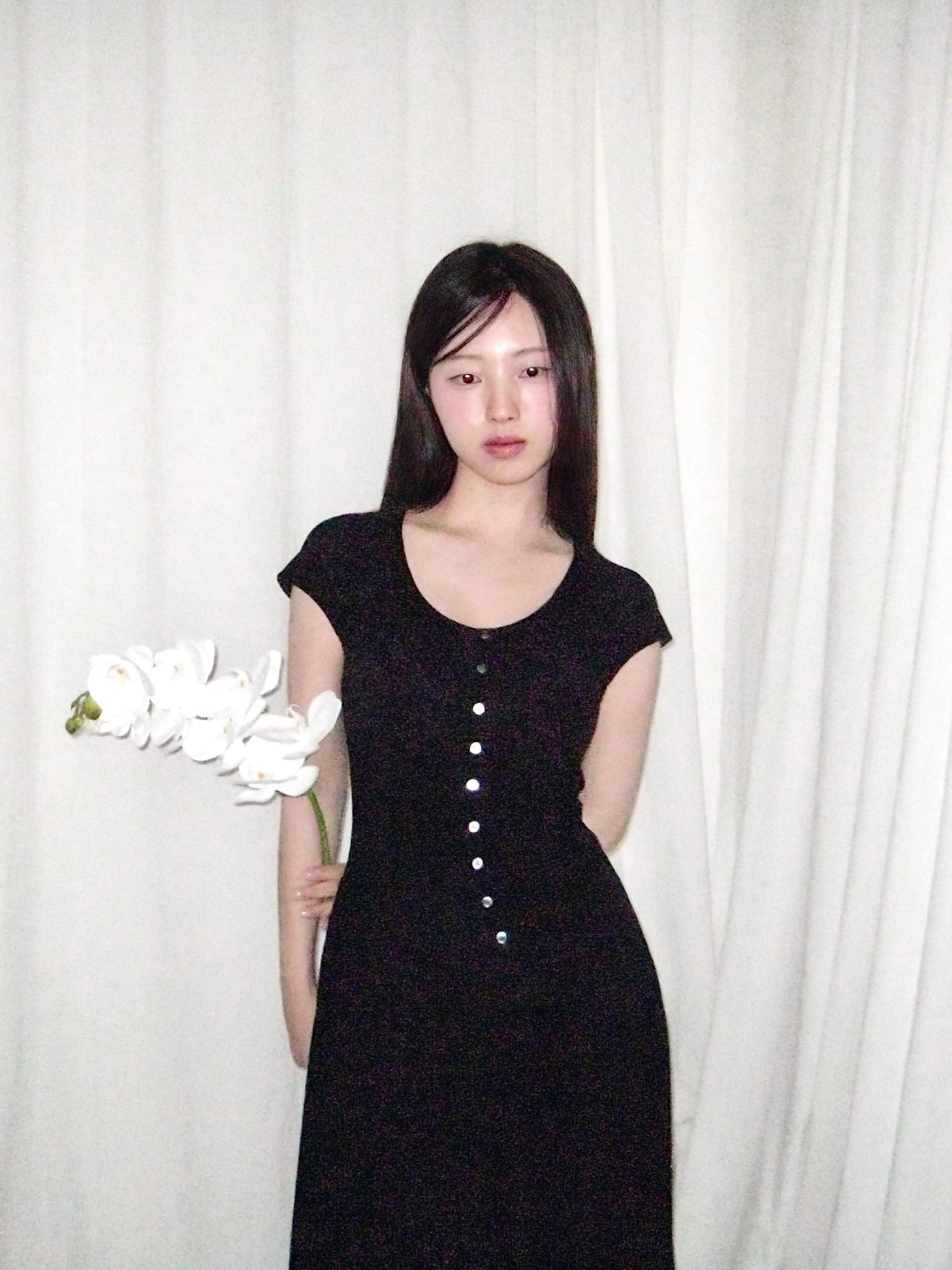 1920년대 부두아 스타일의 은밀하고 섬세한 우아함에서 영감을 받은 소프트 저지 드레스입니다. 상체 디자인은 안쪽의 패널이 몸을 타이트하게 잡아주고 겉 레이어의 단추 디자인이 아름답게 연출됩니다. 천연 흑진주 자개 단추의 광택은 절제된 우아함을 더합니다. 허리에서 자연스럽게 이어지는 스커트는 짧은 안감의 길이로 비침을 방지하면서 가벼움을 더하였고 밑단 쪽에는 원단의 은은한 비침을 살려 센슈얼한 무드를 연출합니다. 몸판과 하나로 재단된 캡 소매는 어깨선을 감싸며 부드러운 어깨 실루엣을 완성합니다.