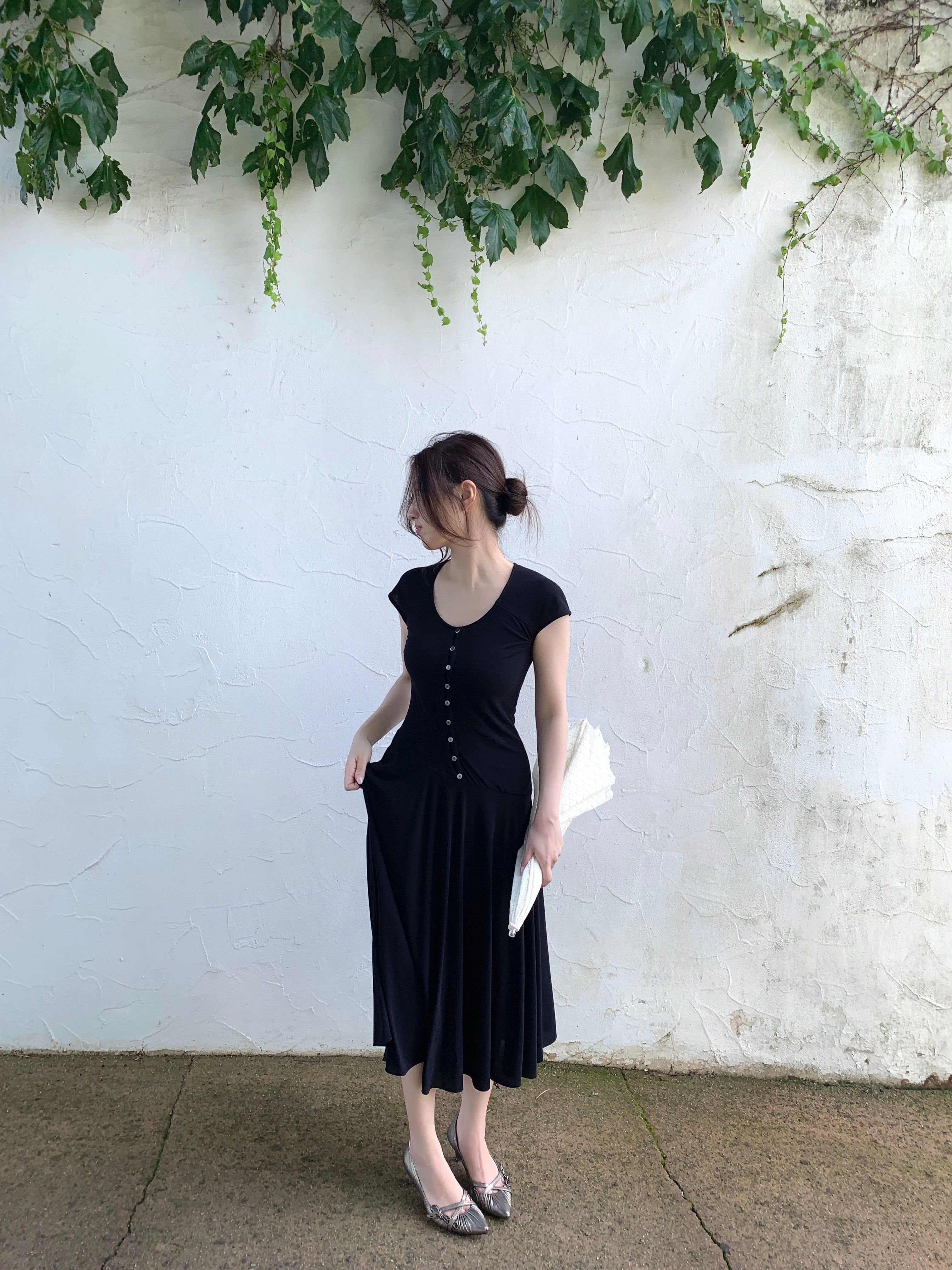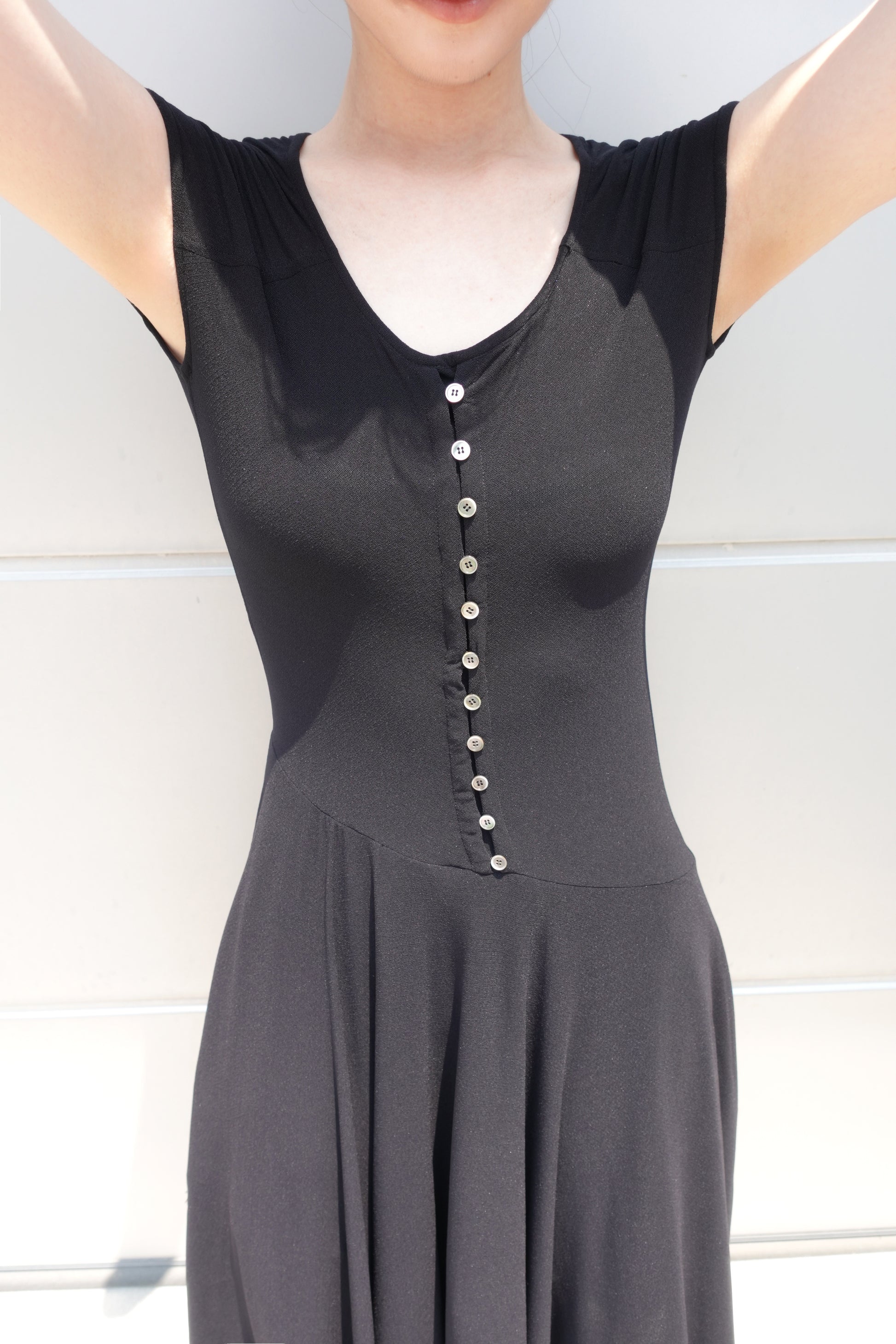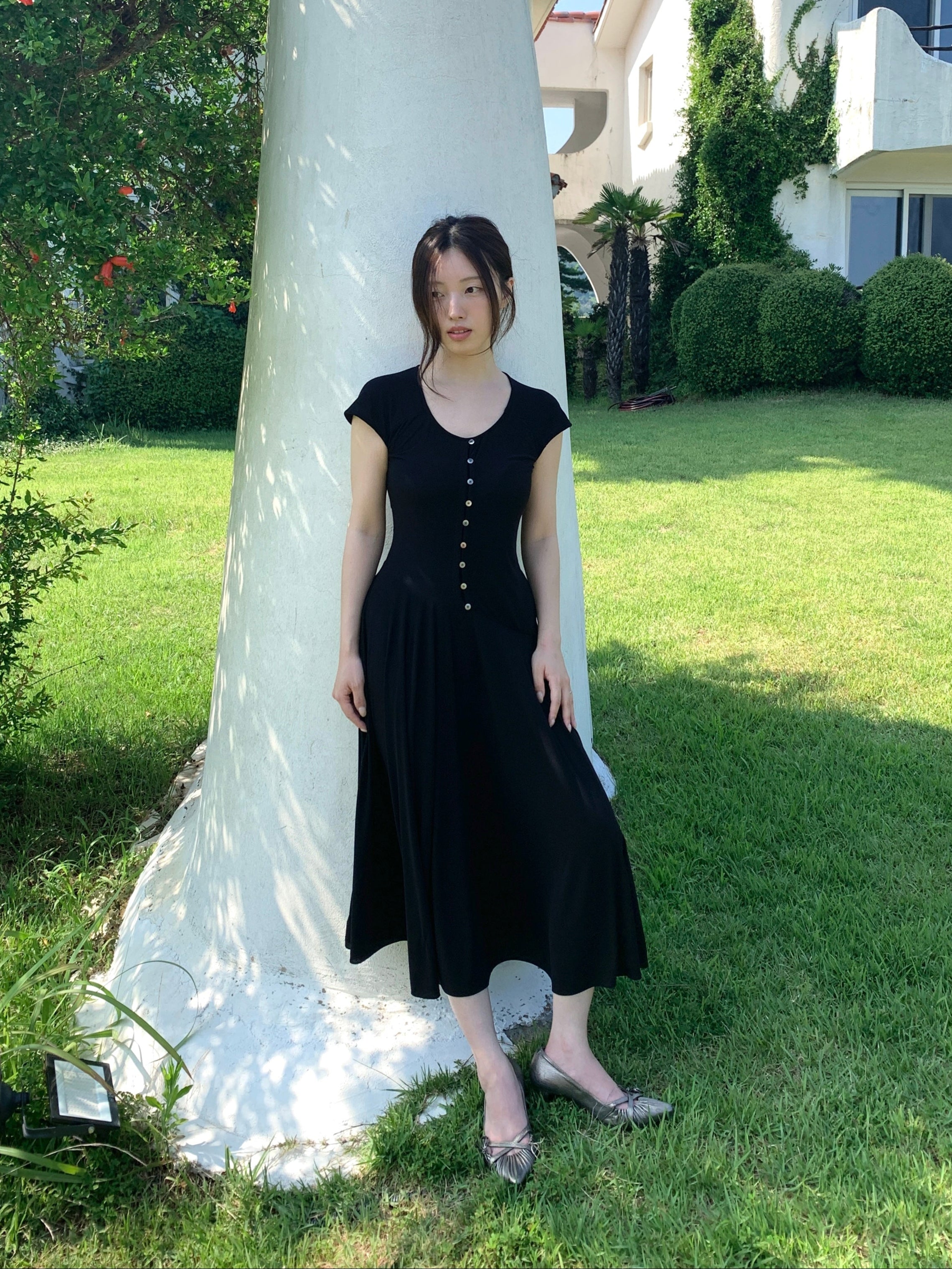 1920년대 부두아 스타일의 은밀하고 섬세한 우아함에서 영감을 받은 소프트 저지 드레스입니다. 상체 디자인은 안쪽의 패널이 몸을 타이트하게 잡아주고 겉 레이어의 단추 디자인이 아름답게 연출됩니다. 천연 흑진주 자개 단추의 광택은 절제된 우아함을 더합니다. 허리에서 자연스럽게 이어지는 스커트는 짧은 안감의 길이로 비침을 방지하면서 가벼움을 더하였고 밑단 쪽에는 원단의 은은한 비침을 살려 센슈얼한 무드를 연출합니다. 몸판과 하나로 재단된 캡 소매는 어깨선을 감싸며 부드러운 어깨 실루엣을 완성합니다.