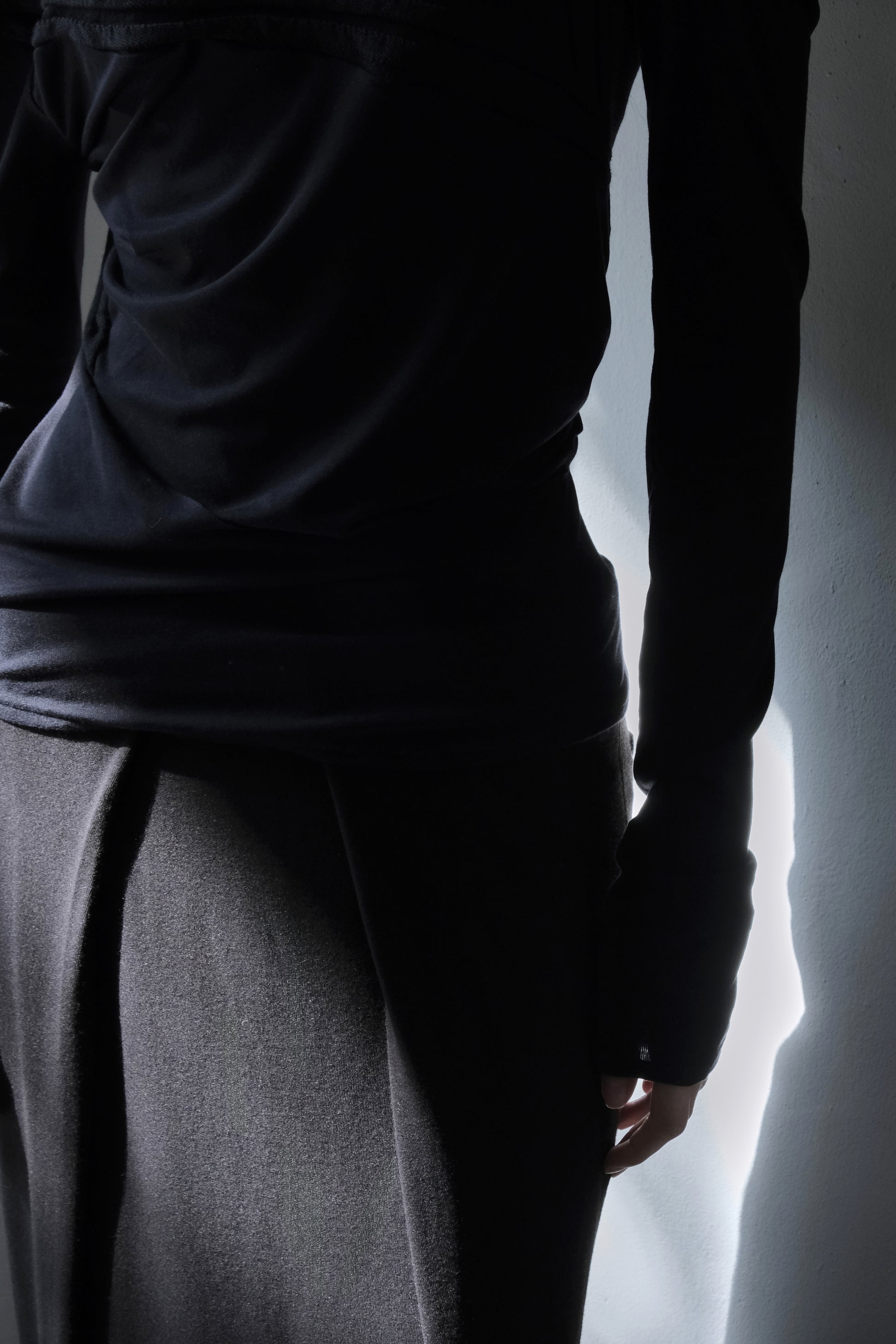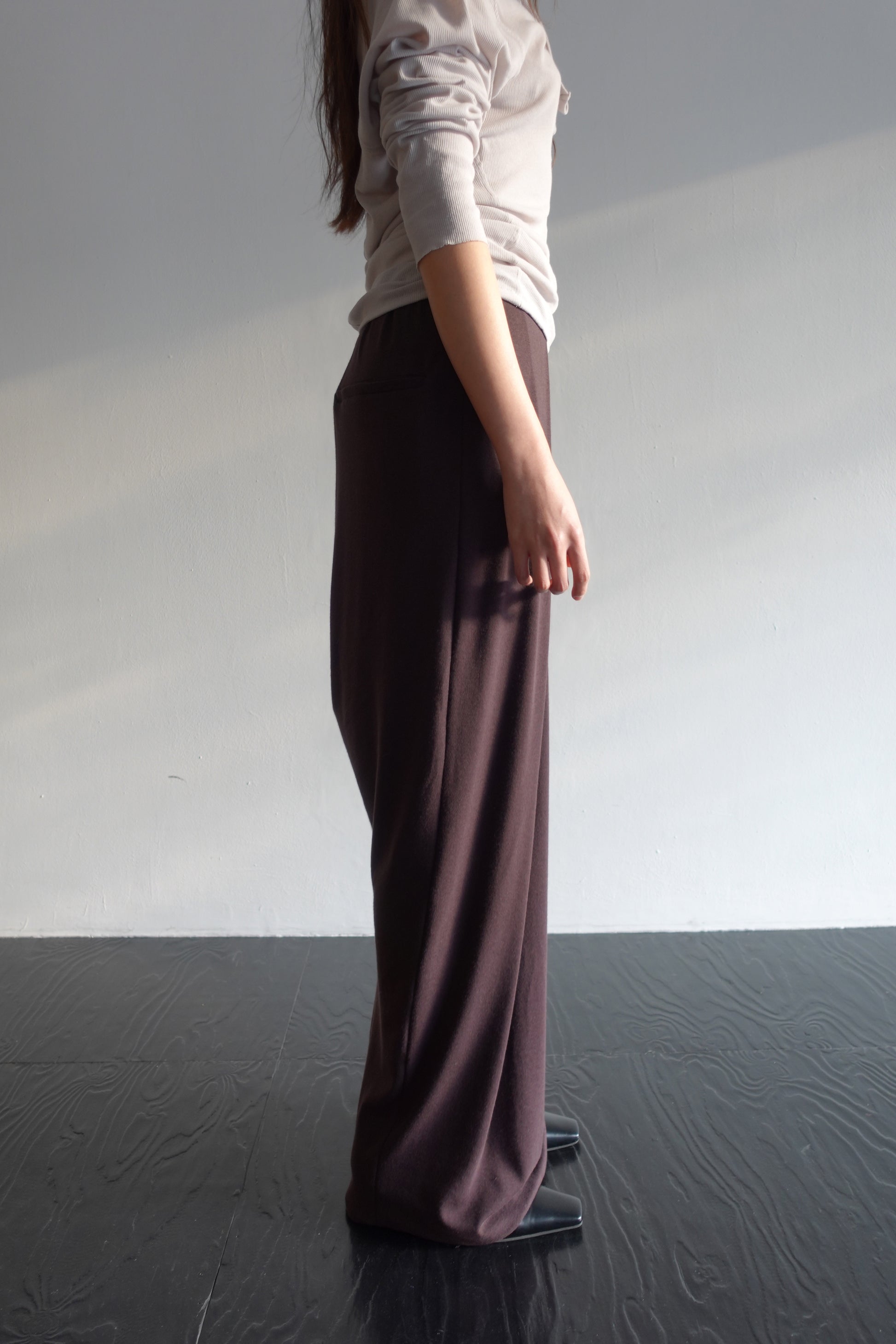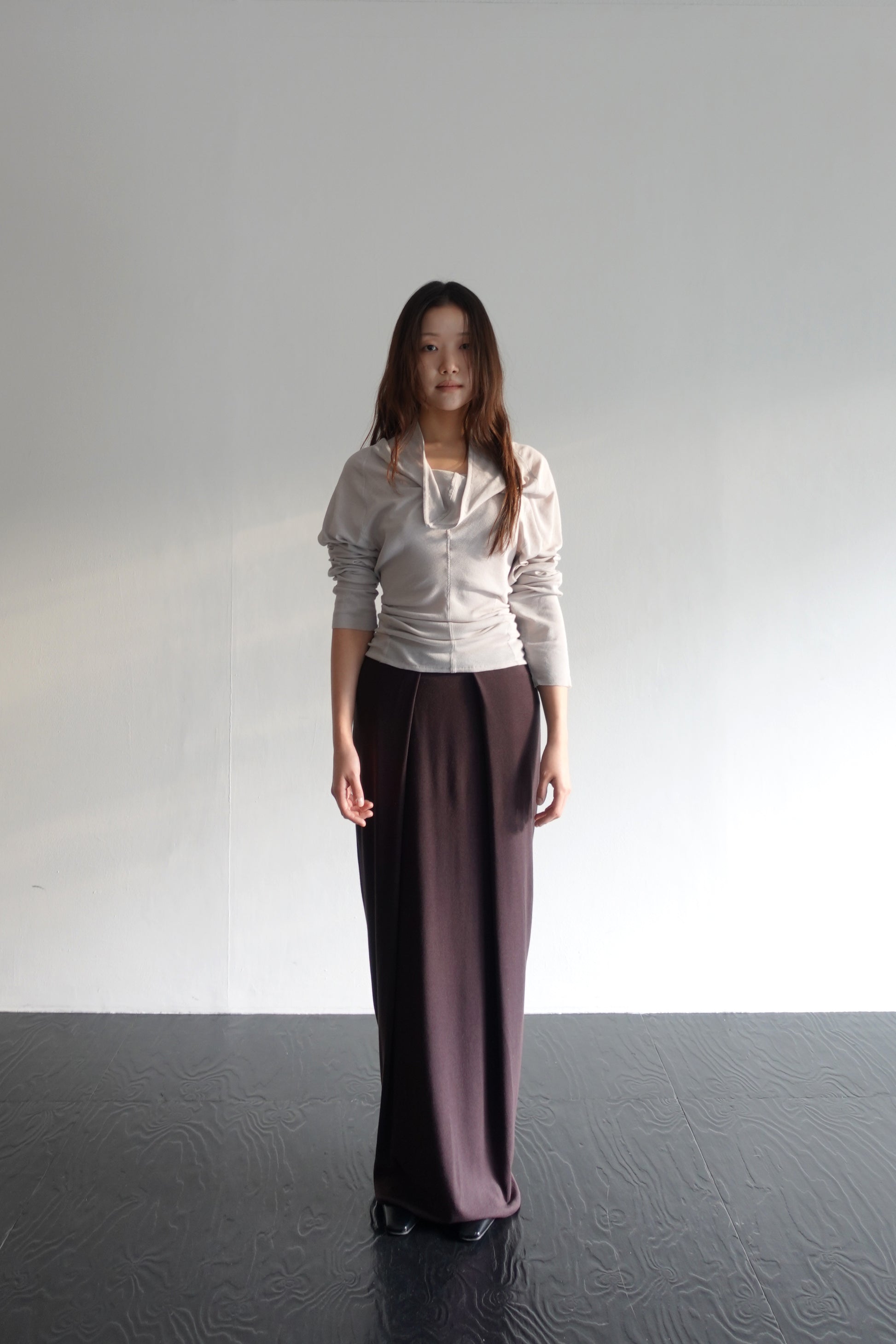 A full-length jersey skirt made from Japanese rayon–wool rib jersey—compact yet soft, with a quiet stretch. The skirt’s fluid vertical ribs gently wrap and release around the legs, forming draped folds with each step. The elasticated waistband provides comfort while maintaining structure.