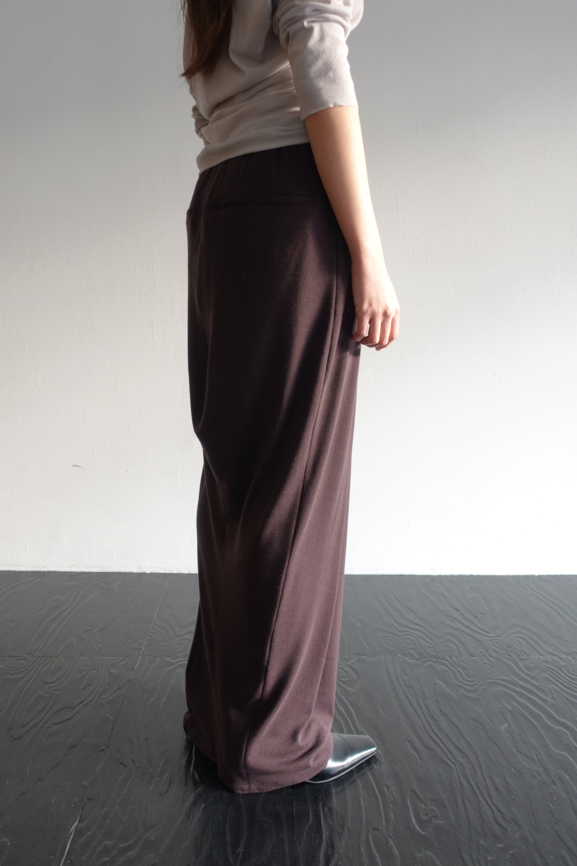 The hem is finished with flatlock stitching—without a slit—allowing the circumference to expand subtly as you walk. This construction creates a distinctive draped silhouette that develops naturally despite the narrow opening. Subtly curved side seams evoke a gentle sway, while the lightweight hem falls cleanly without added weight, pooling softly at the floor. The result is a relaxed elegance shaped through understated volume, pairing effortlessly with everything from fitted tops to heavier knitwear.