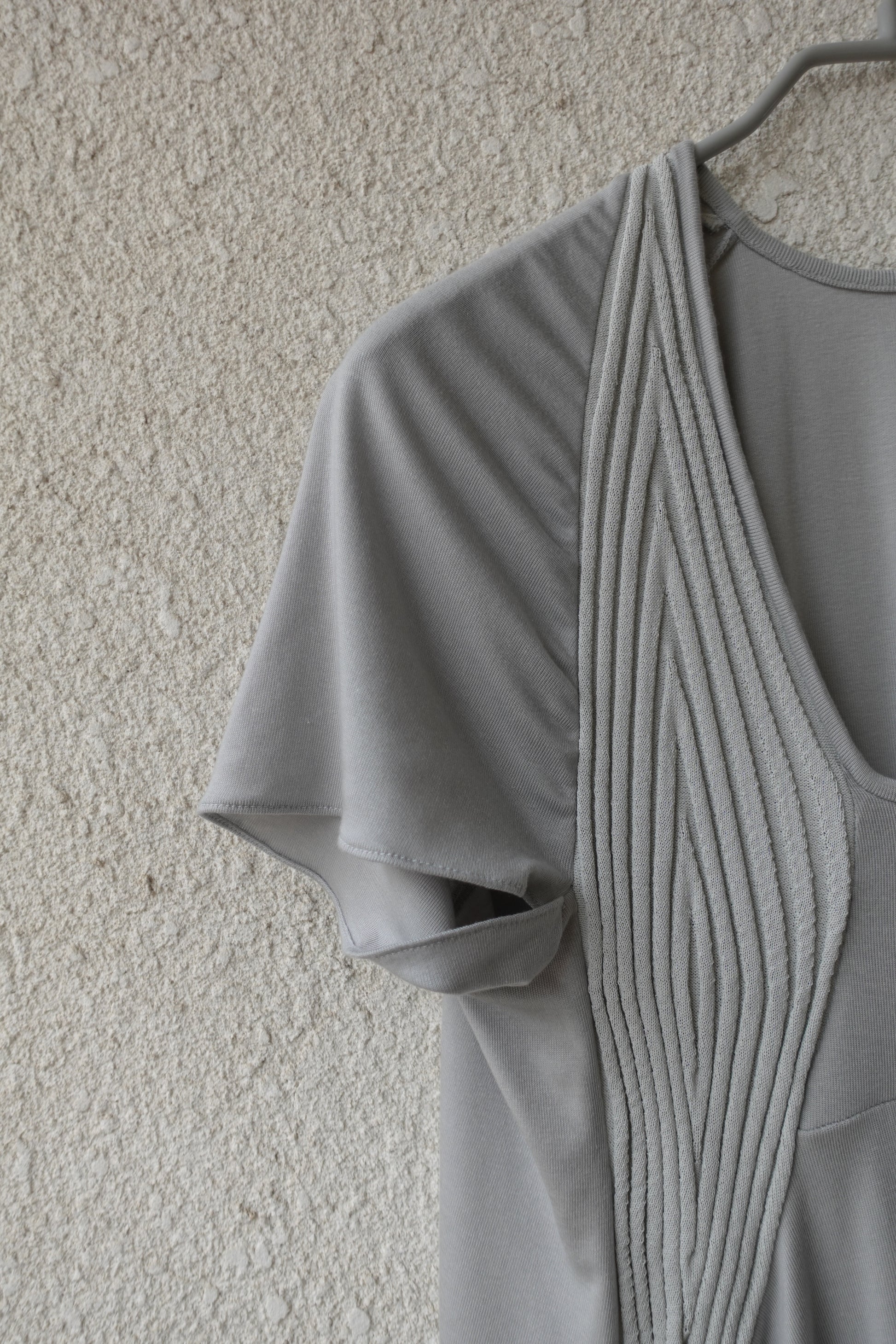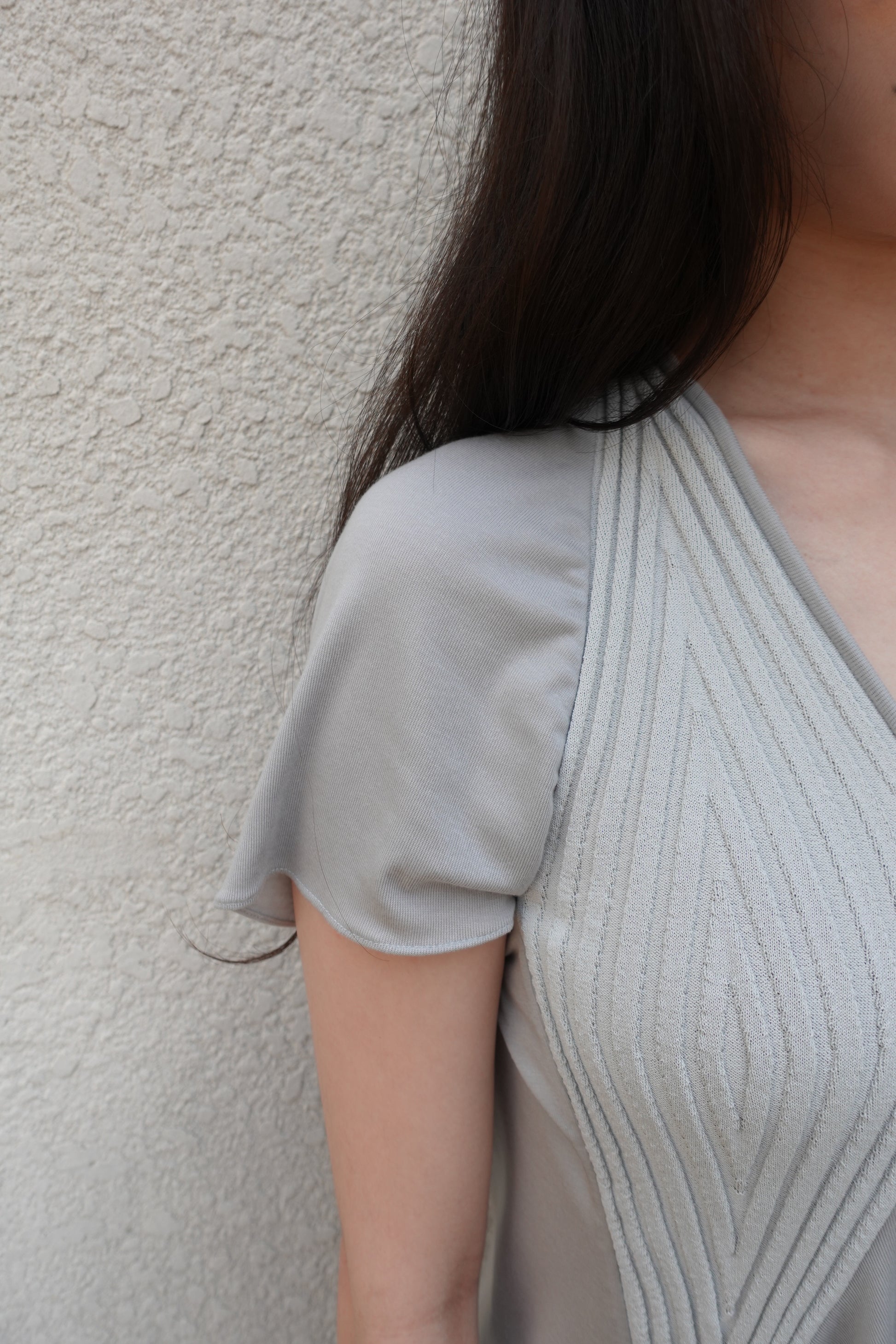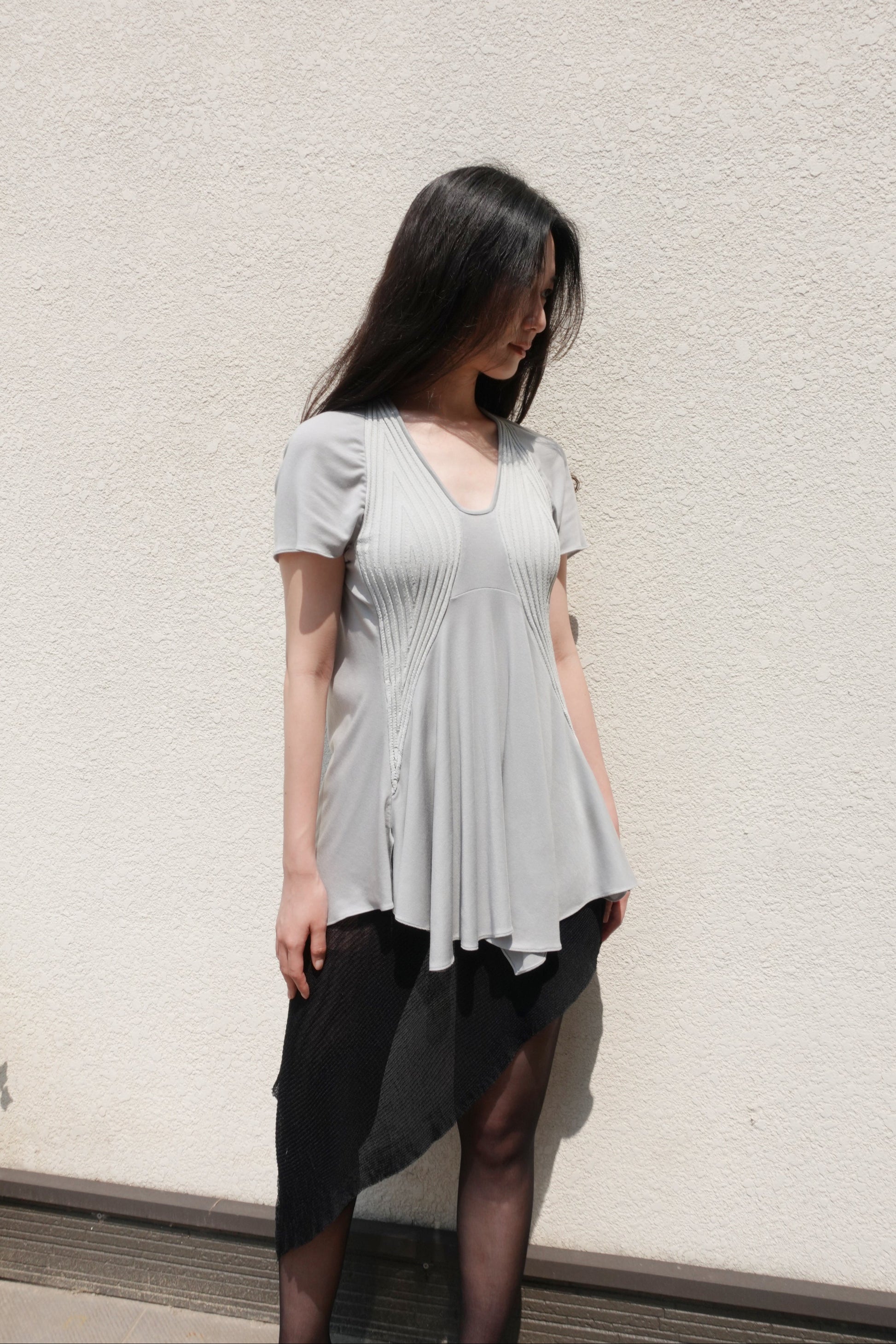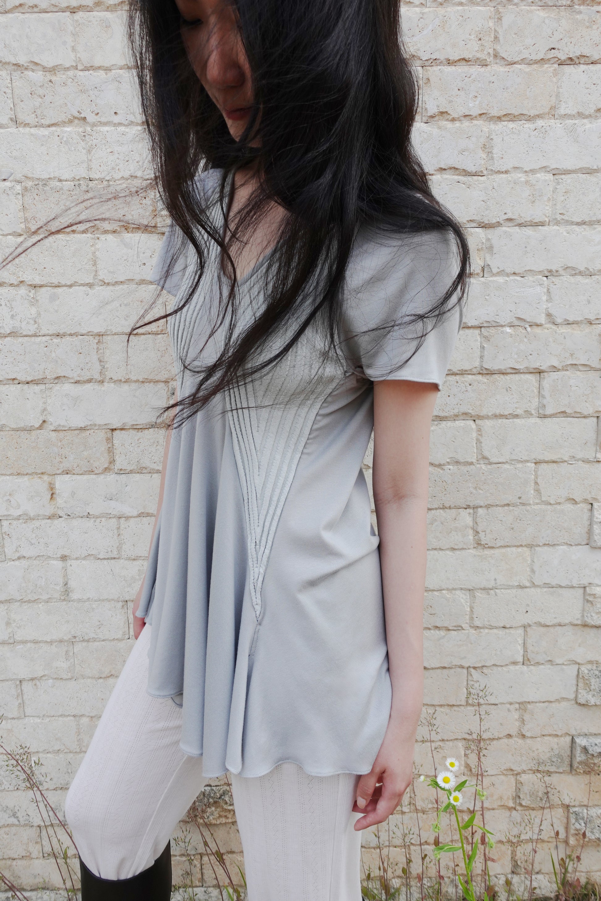 부드럽고 밀도 높은 저지 원단에 텍스처가 느껴지는 니트 패널을 더해 제작된 반소매 탑입니다. 깊게 파인 U 네크라인과 조각된 듯한 리브 패널이 바스트 라인을 따라 입체적인 실루엣을 연출합니다. 밑단은 자연스럽게 퍼지며 유려하게 흐르는 라인으로 비정형적인 실루엣을 형성해 정교하면서도 릴렉스한 감각을 동시에 전달합니다. 워싱된 미스트 그레이 컬러로, 구조적인 설계와 유기적인 드레이프가 조화롭게 어우러지는 탑 입니다. 짧은 하의와 매치해 미니 드레스 스타일로 연출하거나, 와이드 저지 팬츠와 함께 편안한 라운지웨어로 즐기실 수 있습니다. 또한 스키니 팬츠나 롱부츠와 코디하면 우아하면서도 자유로운 무드가 더해져 다양한 스타일링이 가능합니다.