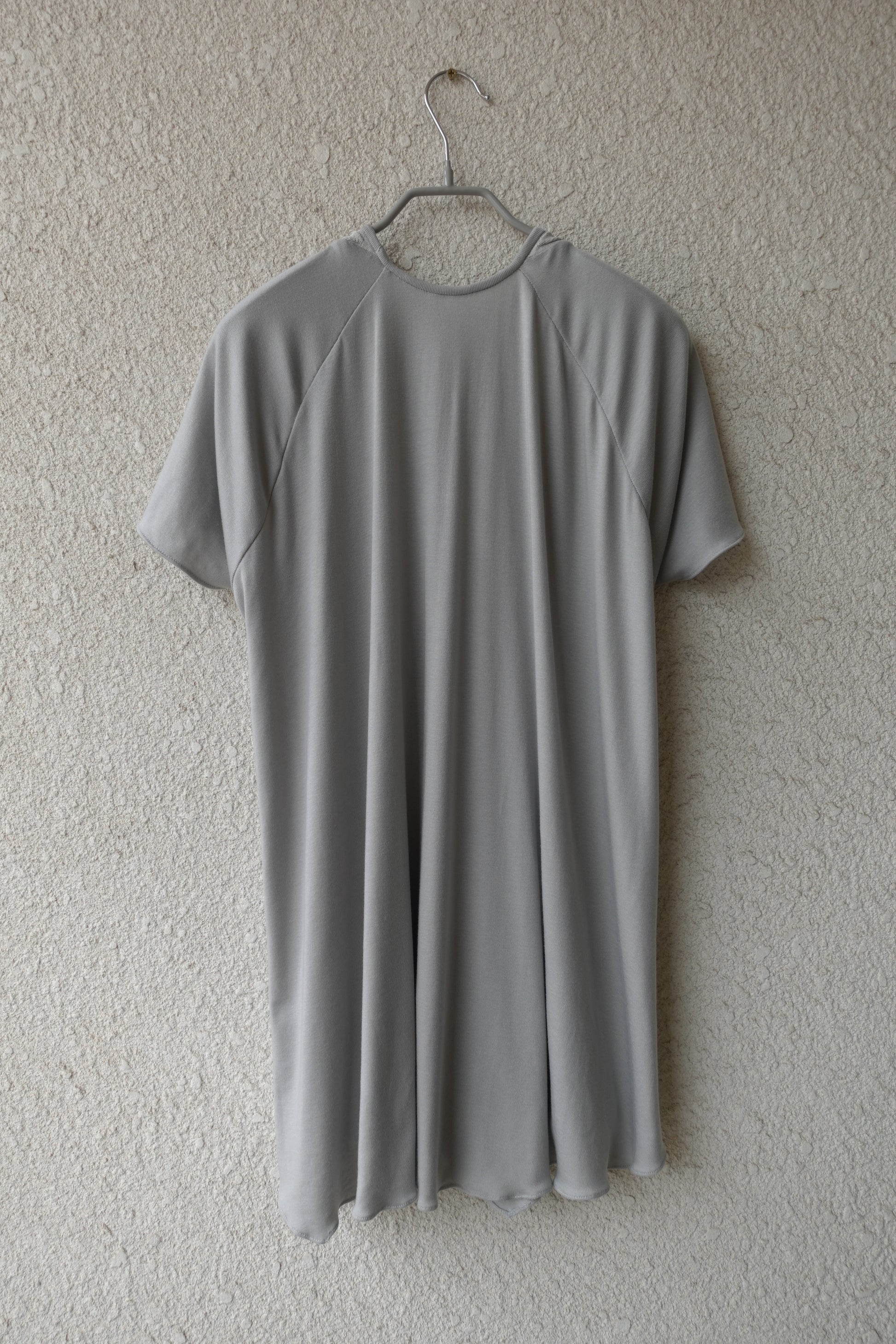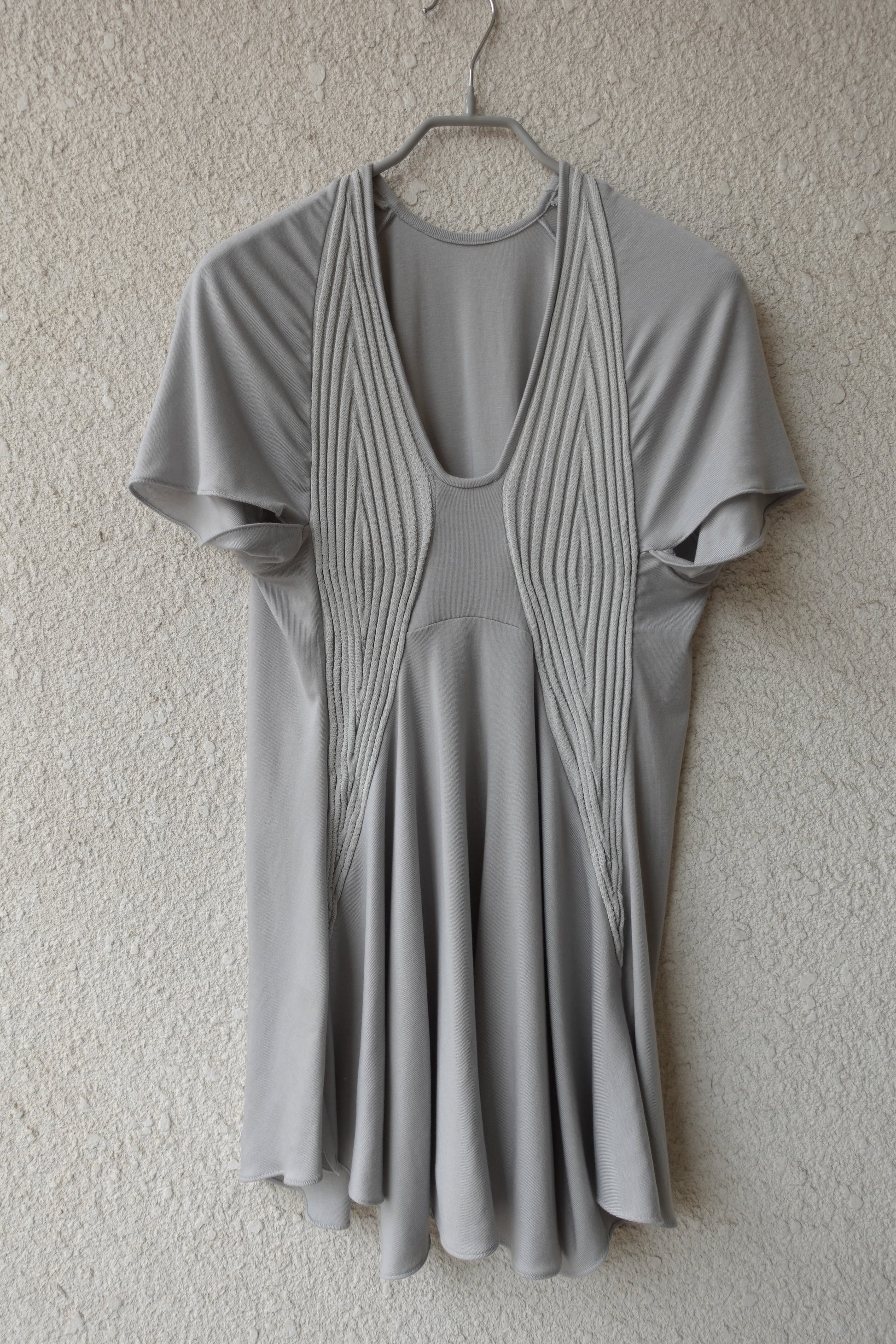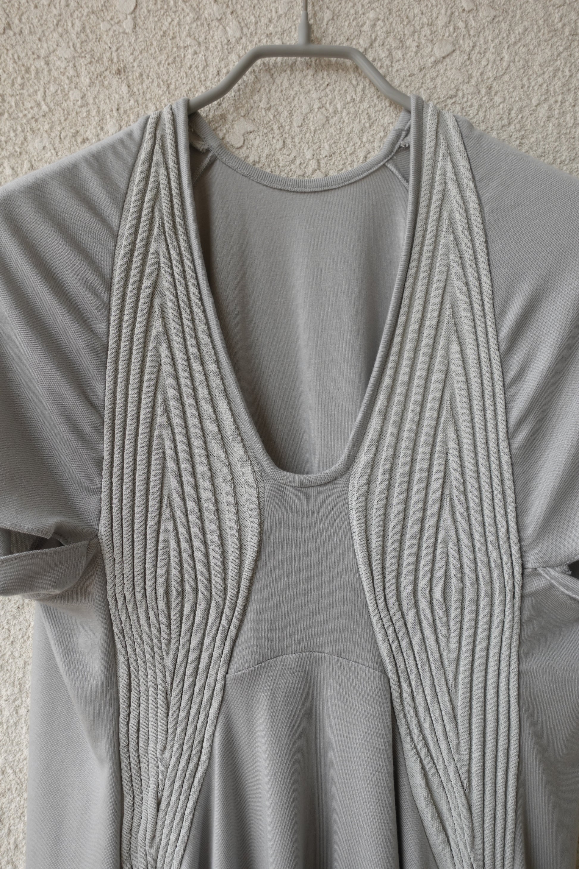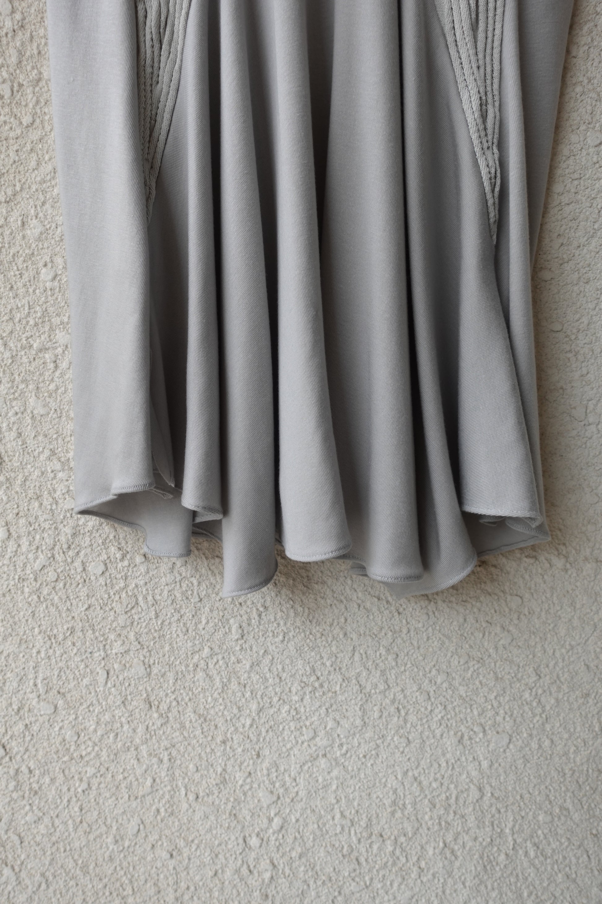 부드럽고 밀도 높은 저지 원단에 텍스처가 느껴지는 니트 패널을 더해 제작된 반소매 탑입니다. 깊게 파인 U 네크라인과 조각된 듯한 리브 패널이 바스트 라인을 따라 입체적인 실루엣을 연출합니다. 밑단은 자연스럽게 퍼지며 유려하게 흐르는 라인으로 비정형적인 실루엣을 형성해 정교하면서도 릴렉스한 감각을 동시에 전달합니다. 워싱된 미스트 그레이 컬러로, 구조적인 설계와 유기적인 드레이프가 조화롭게 어우러지는 탑 입니다. 짧은 하의와 매치해 미니 드레스 스타일로 연출하거나, 와이드 저지 팬츠와 함께 편안한 라운지웨어로 즐기실 수 있습니다. 또한 스키니 팬츠나 롱부츠와 코디하면 우아하면서도 자유로운 무드가 더해져 다양한 스타일링이 가능합니다.