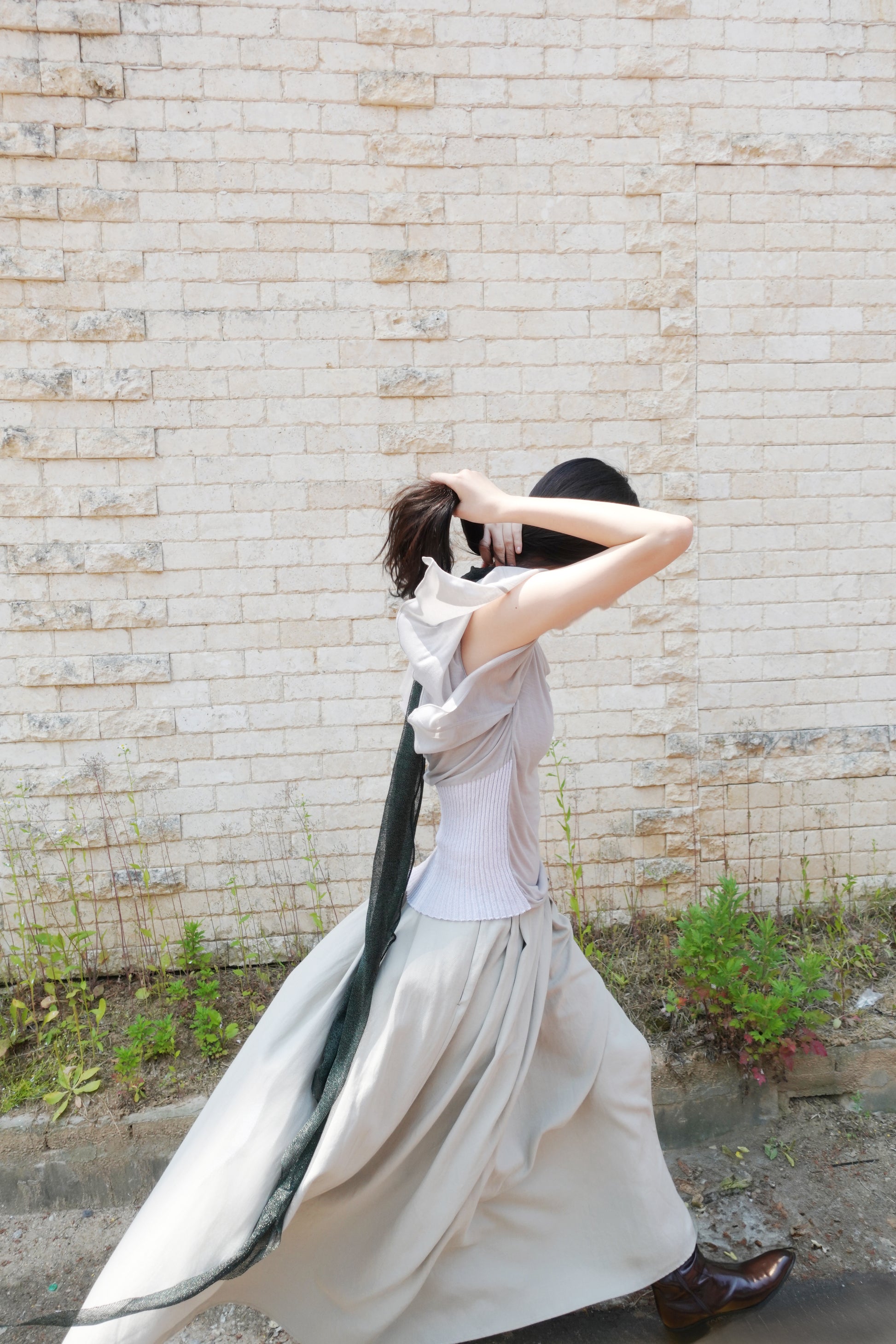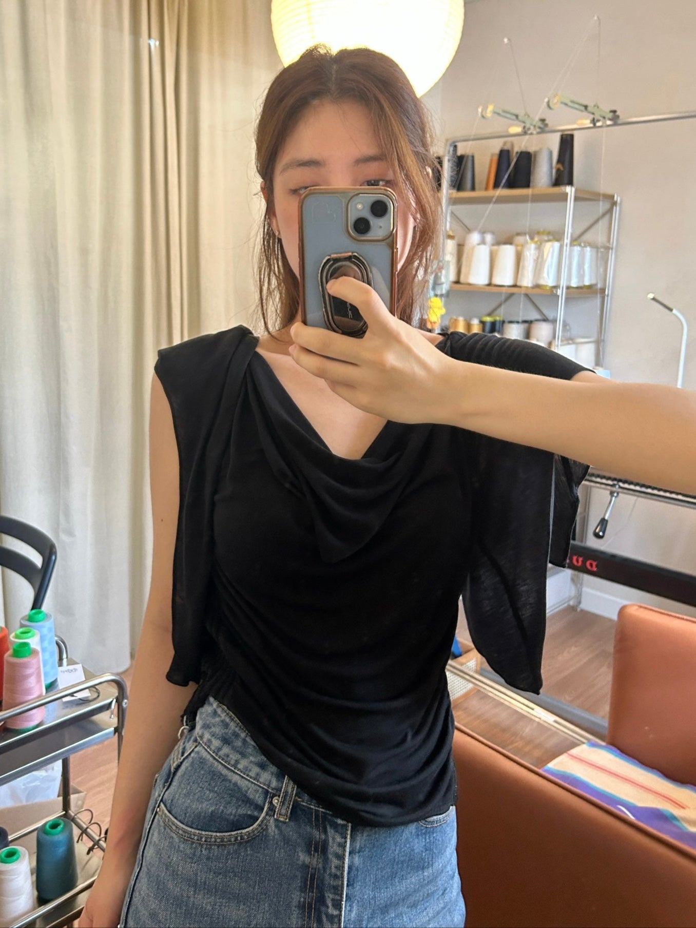 양쪽 어깨를 넥라인 방향으로 가볍게 당겨, 소매가 암홀에 고정되도록 착용해 주세요. 앞,뒤 네크라인에 자연스러운 카울이 형성되어 더욱 우아한 실루엣을 연출할 수 있습니다. 오프숄더 디자인이 아니므로 어깨에 걸쳐 착용할 경우 흘러내릴 수 있습니다.