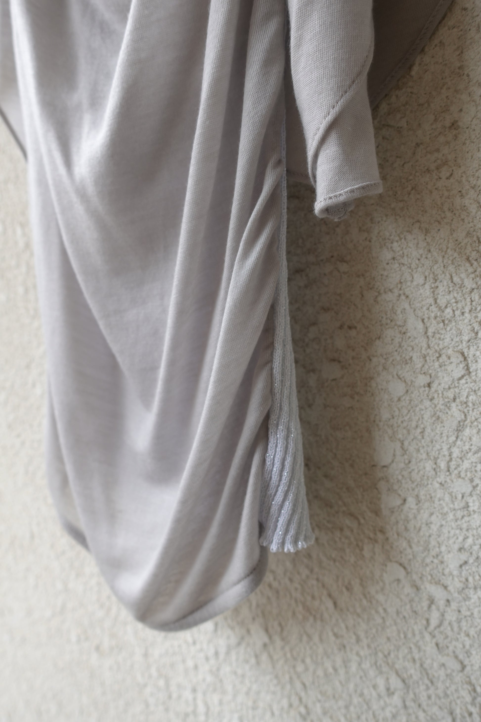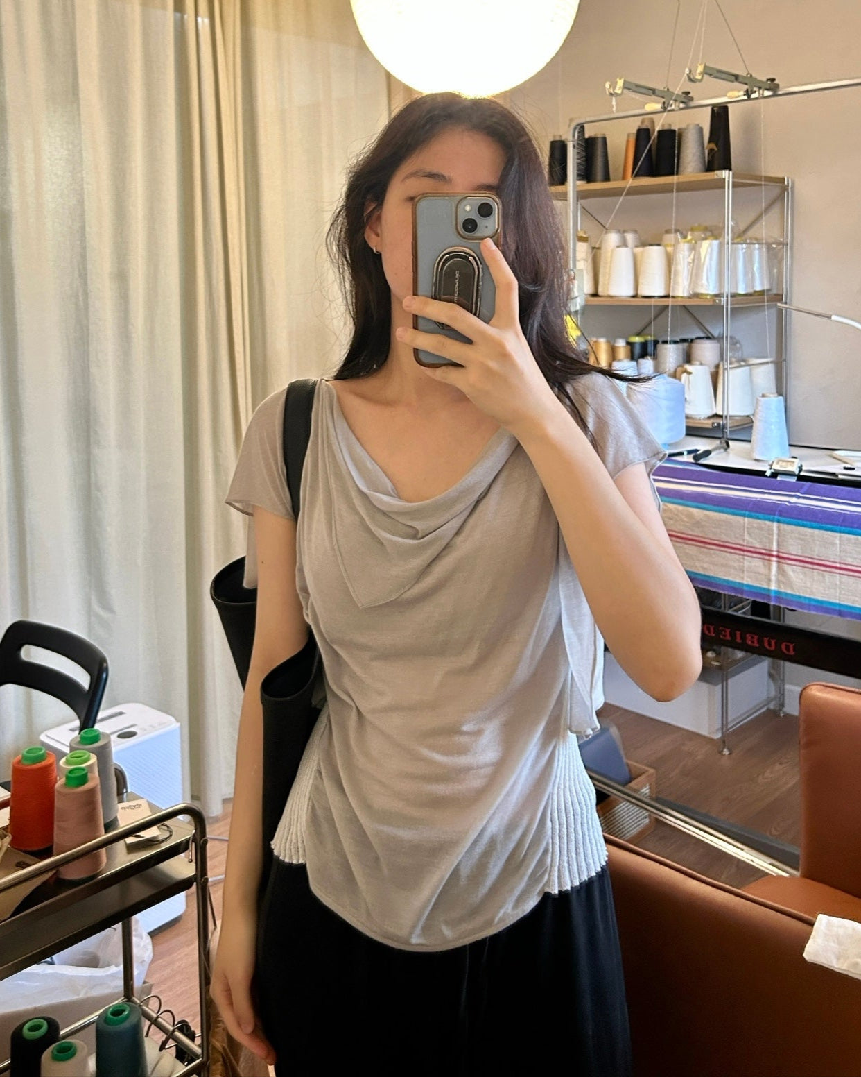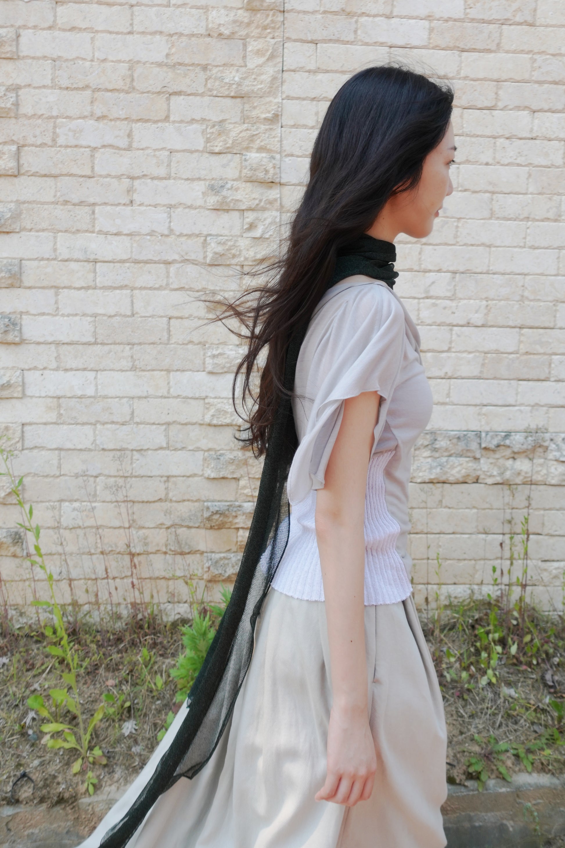 가벼운 코튼 블렌드 원단으로 제작된 반소매 니트 탑입니다. 비대칭 넥라인과 오프셋 숄더 솔기가 특징이며, 등판 리브 조직은 메탈 비스코스 원사가 각도에 따라 은은하게 빛을 반사합니다. 몸에 가까이 떨어지지만 전혀 조이지 않는 실루엣으로, 긴장감과 이완을 동시에 느낄 수 있는 무드를 제안합니다. 여유로운 핏으로 디자인 되었으며, 워시드 라이트 그레이와 블랙 두 컬러로 전개됩니다.