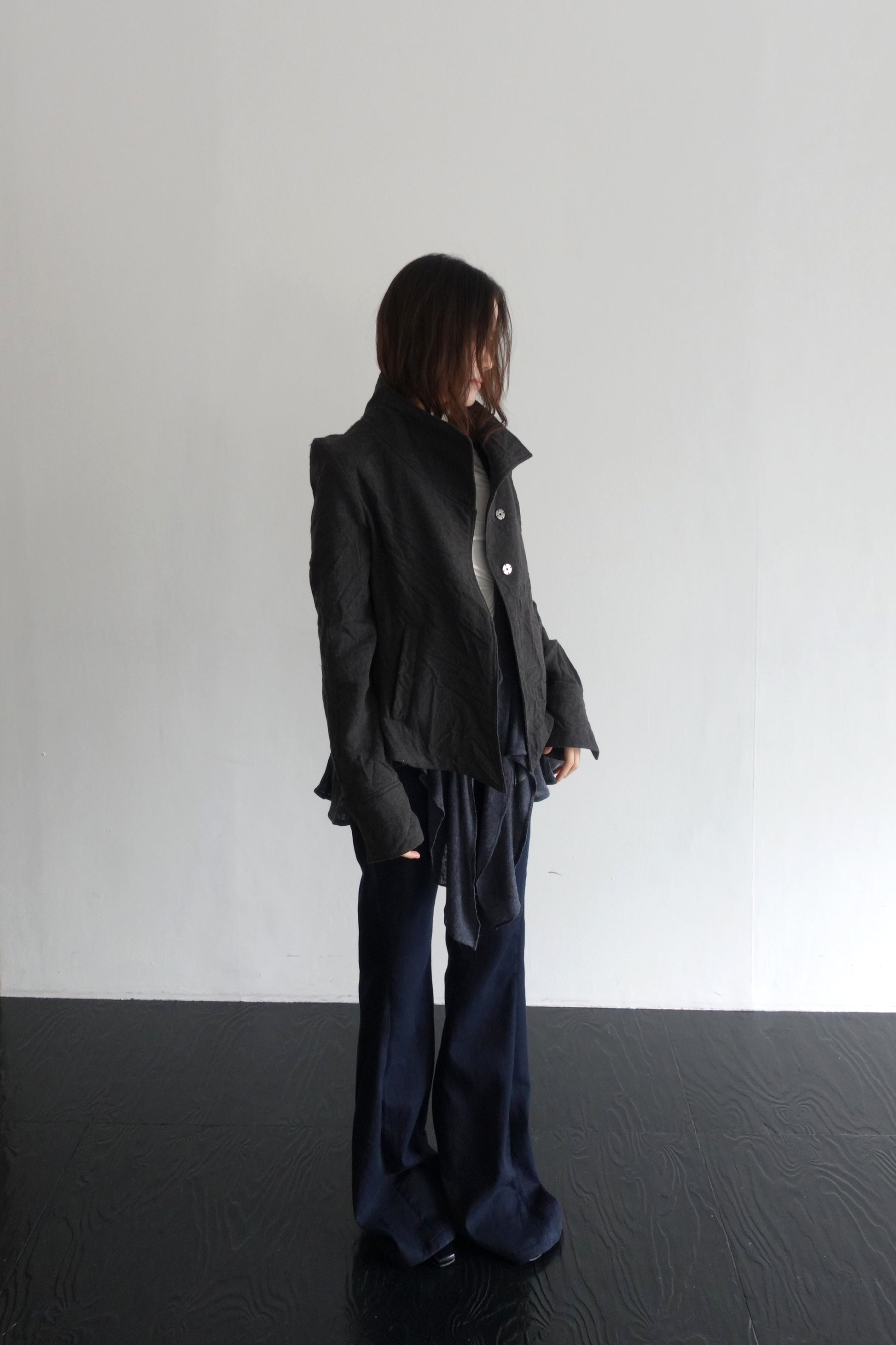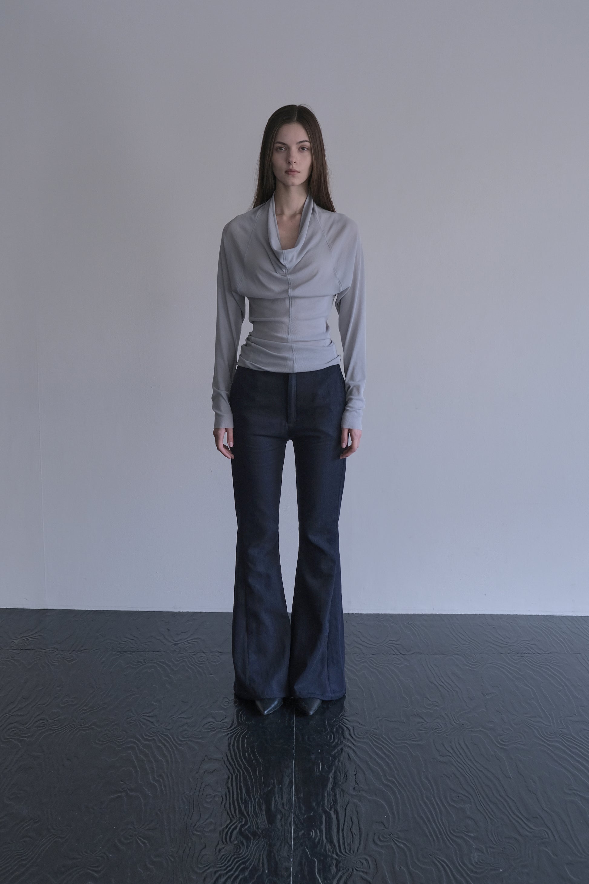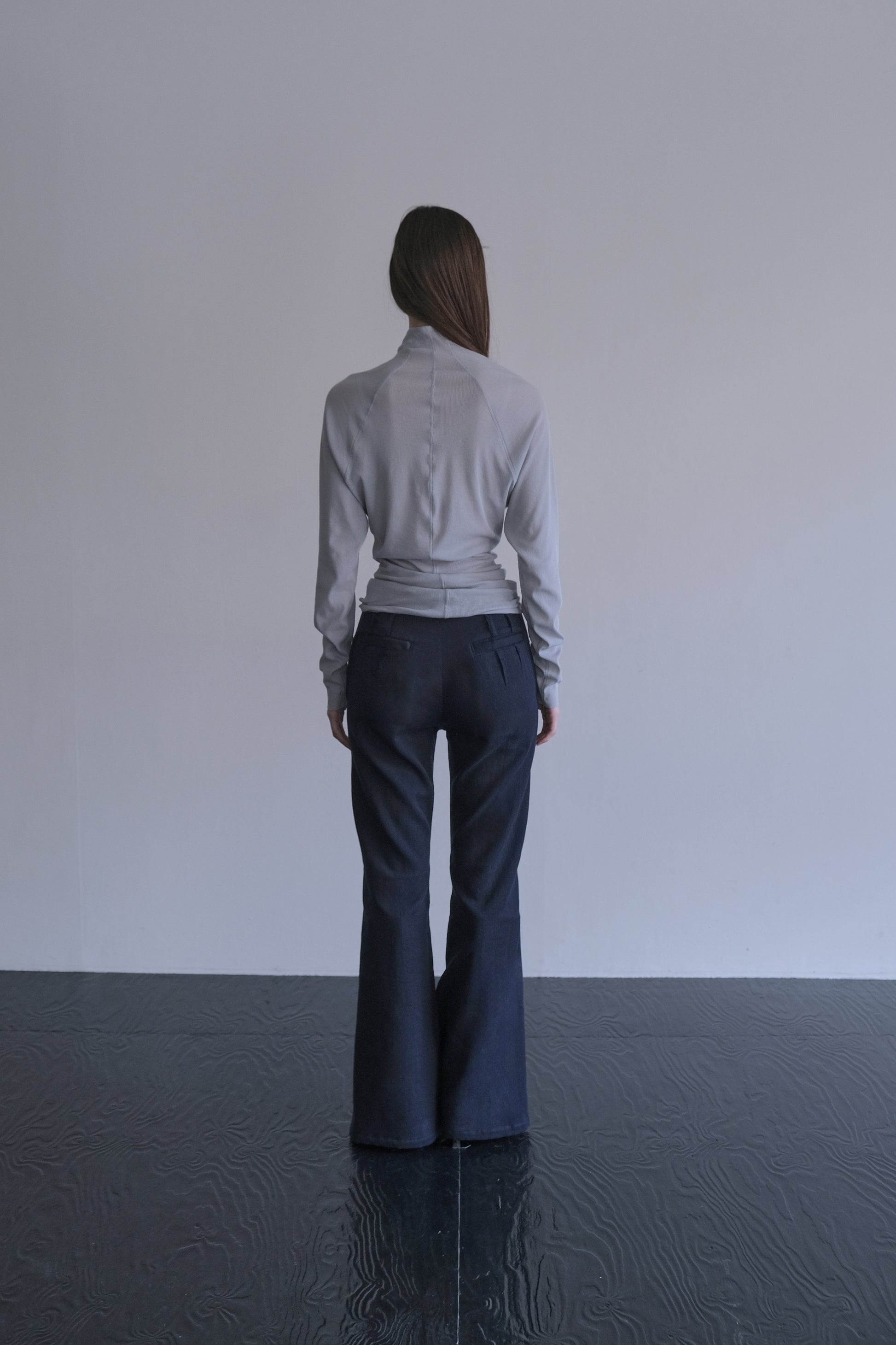 Unlike conventional flares, the silhouette is engineered with volume shifting toward the front, creating a distinctive line that drapes forward with each step. Frayed detailing along the side pocket lines and belt loops introduces a blown-out texture within the structured shape, highlighting Laumière’s signature sense of gentle dishevelment.