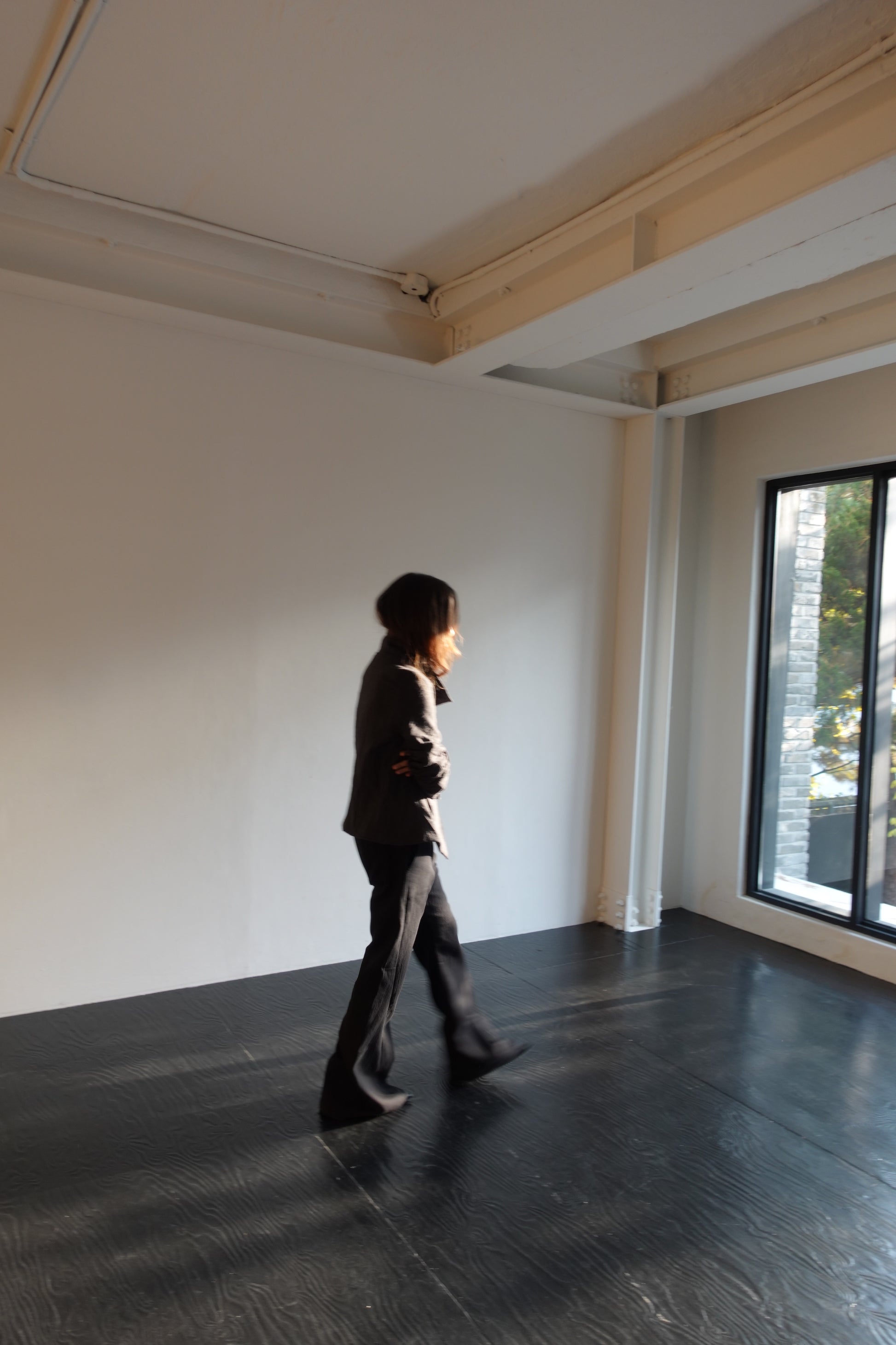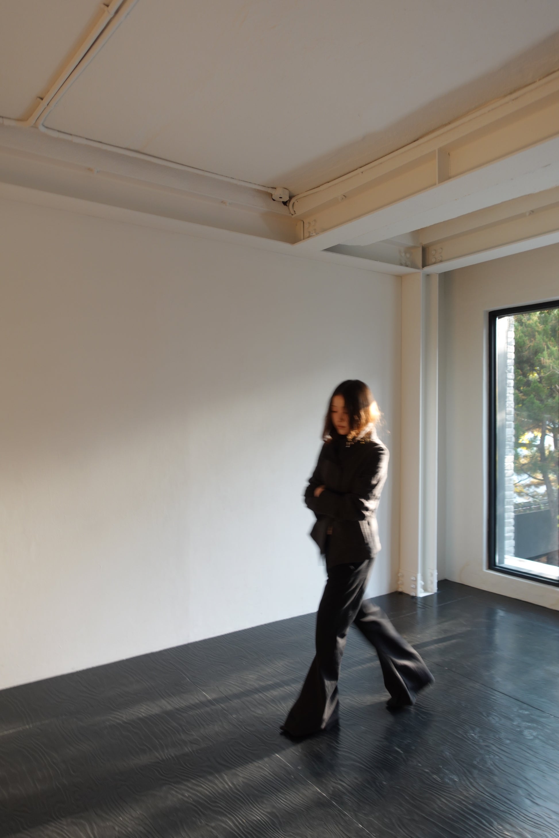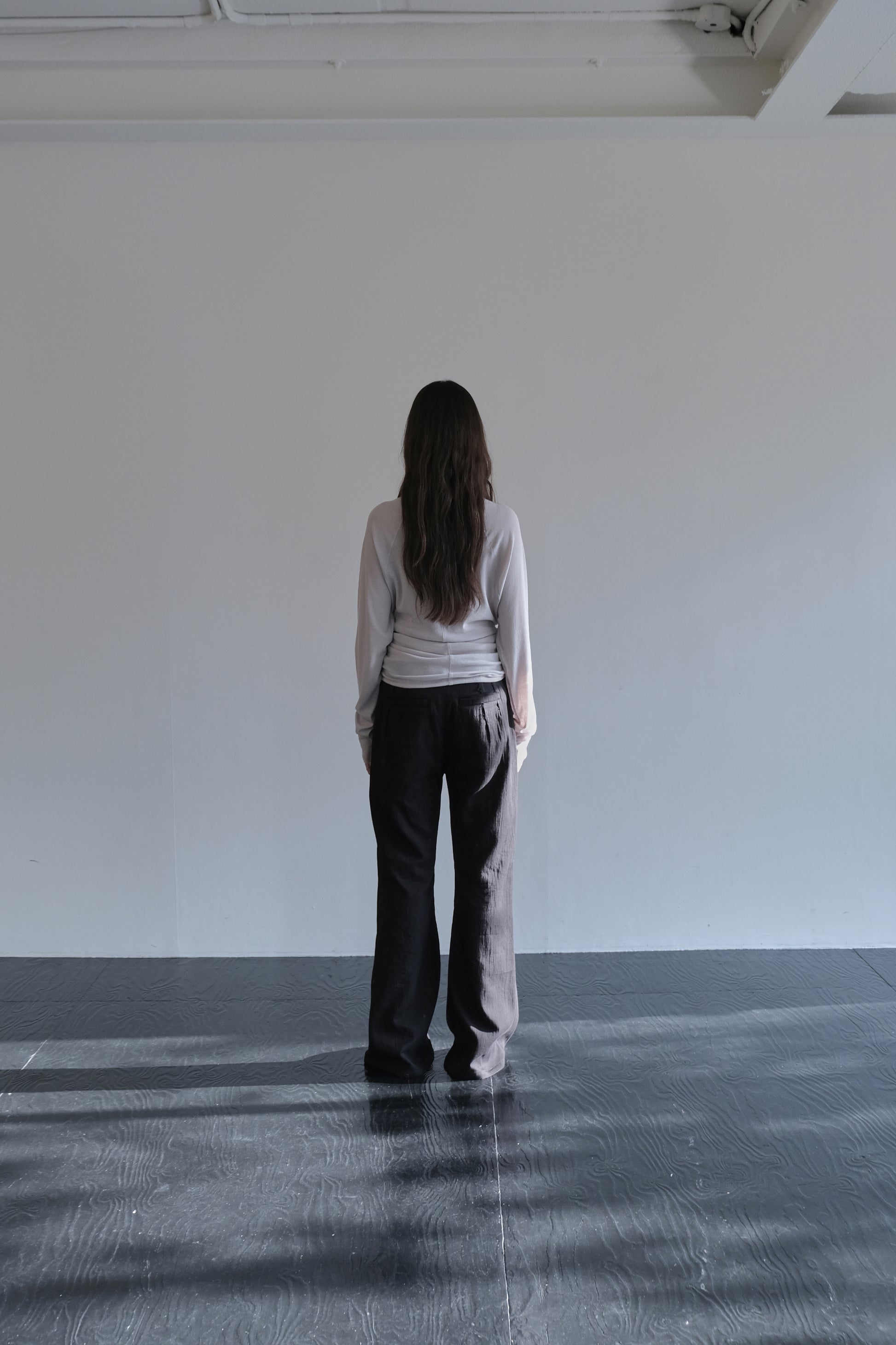 Unlike conventional flares, the silhouette is engineered with volume shifting toward the front, creating a distinctive line that drapes forward with each step. Frayed detailing along the side pocket lines and belt loops introduces a blown-out texture within the structured shape, highlighting Laumière’s signature sense of gentle dishevelment.