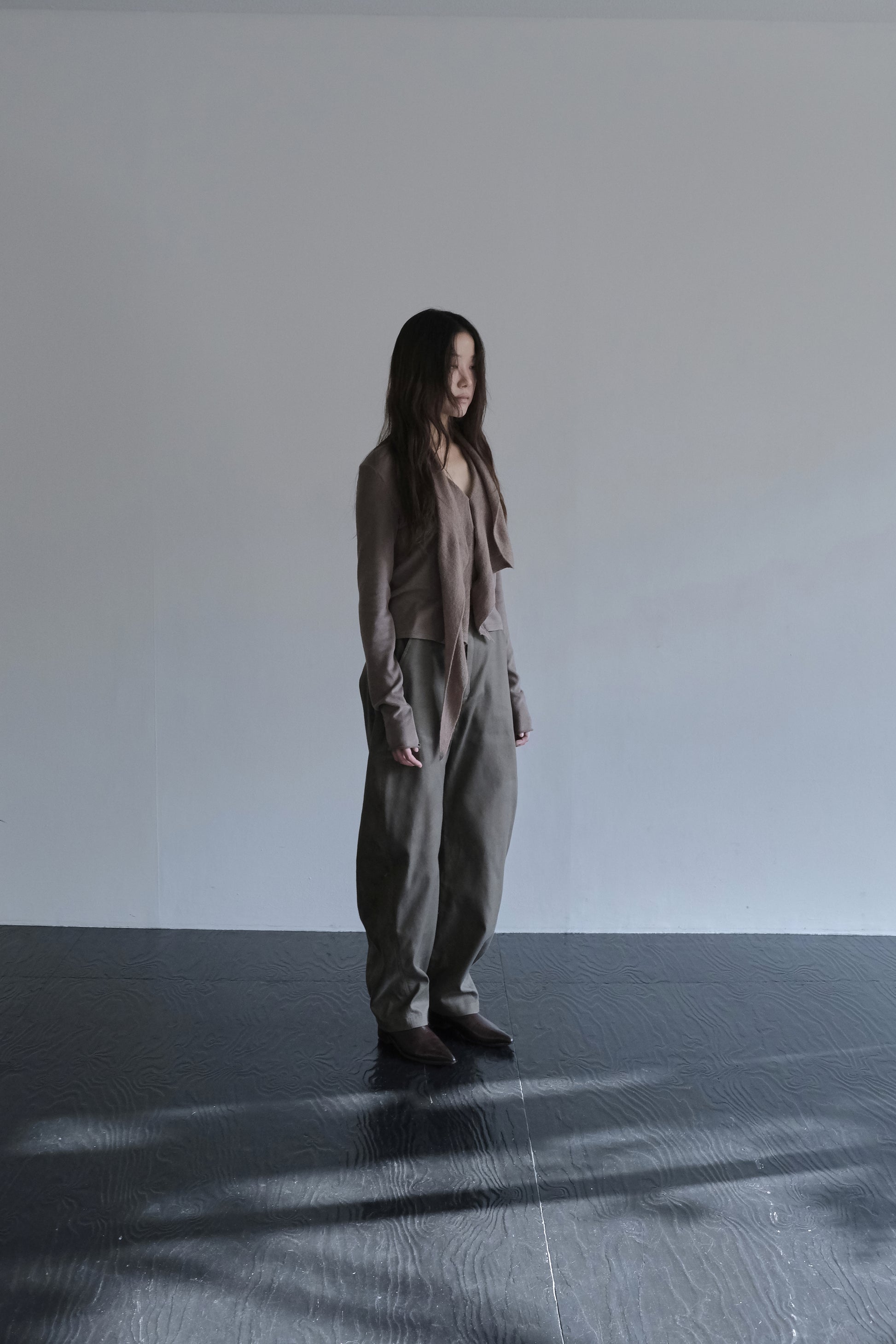 Crafted from a softly brushed cotton twill, these trousers feature a light structure that allows the curved leg line to fall and collapse naturally without rigidity. The rounded volume formed along the side seams creates a gentle sculptural shape, while the back welt pockets add a refined, tailored touch.