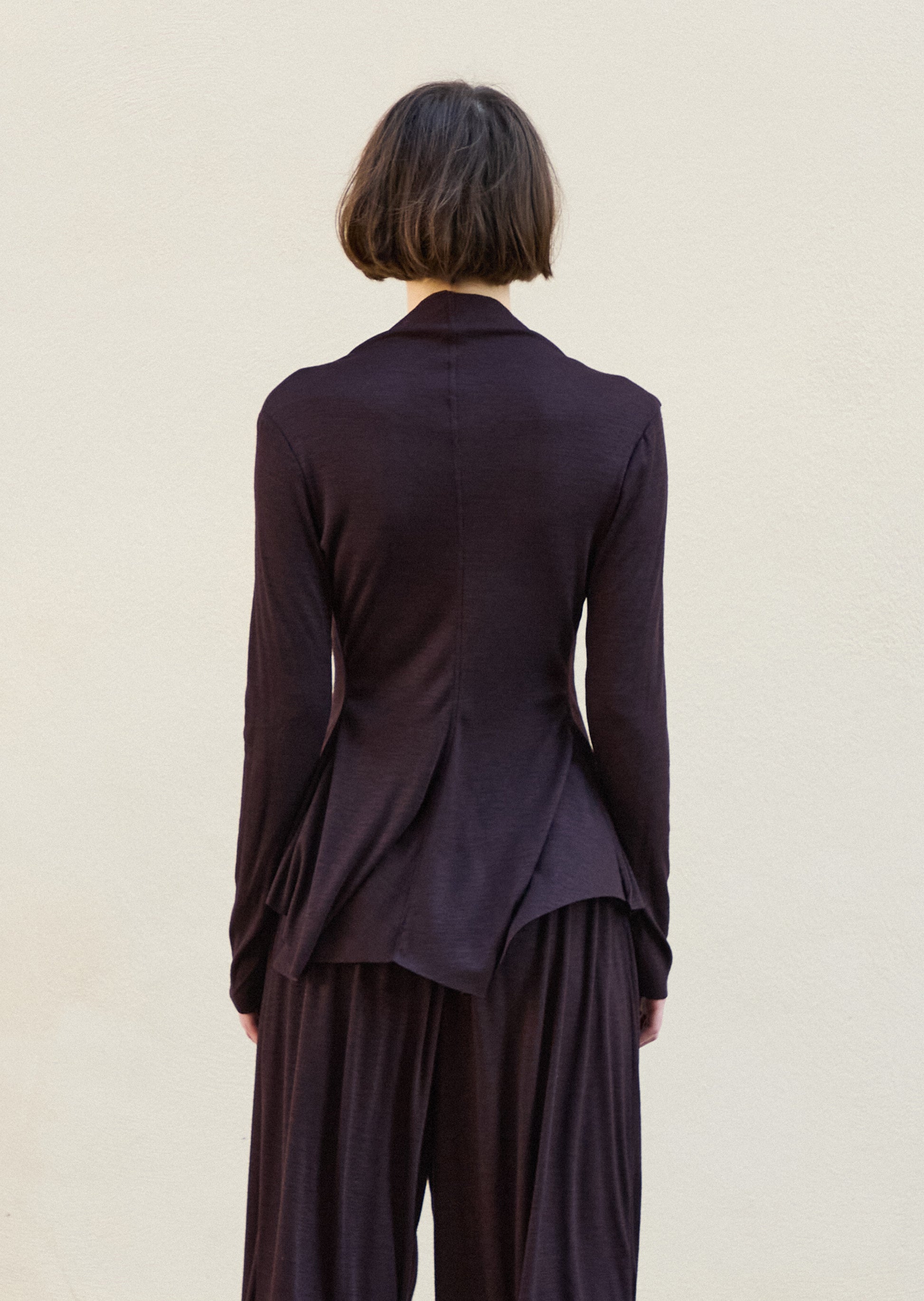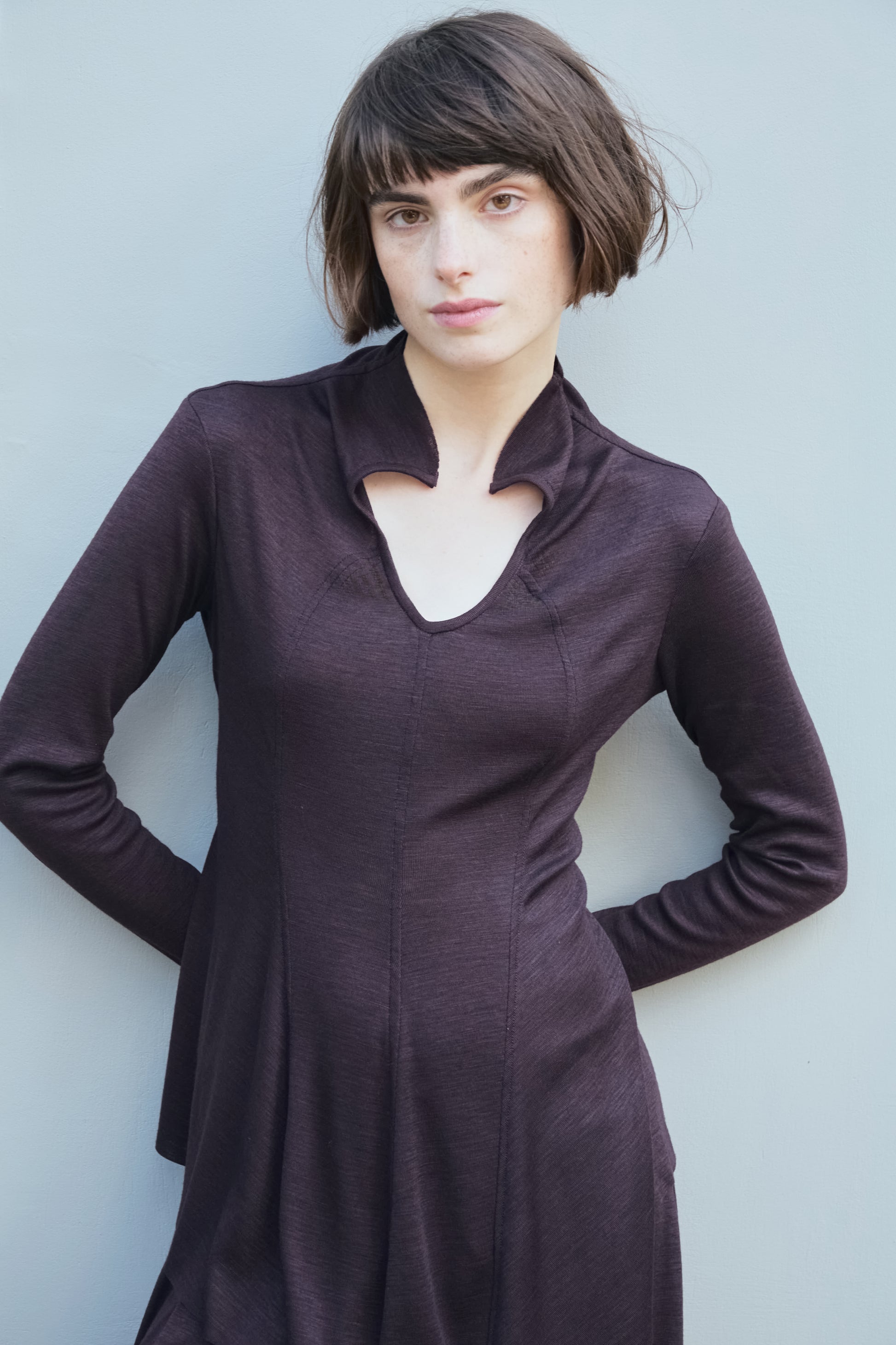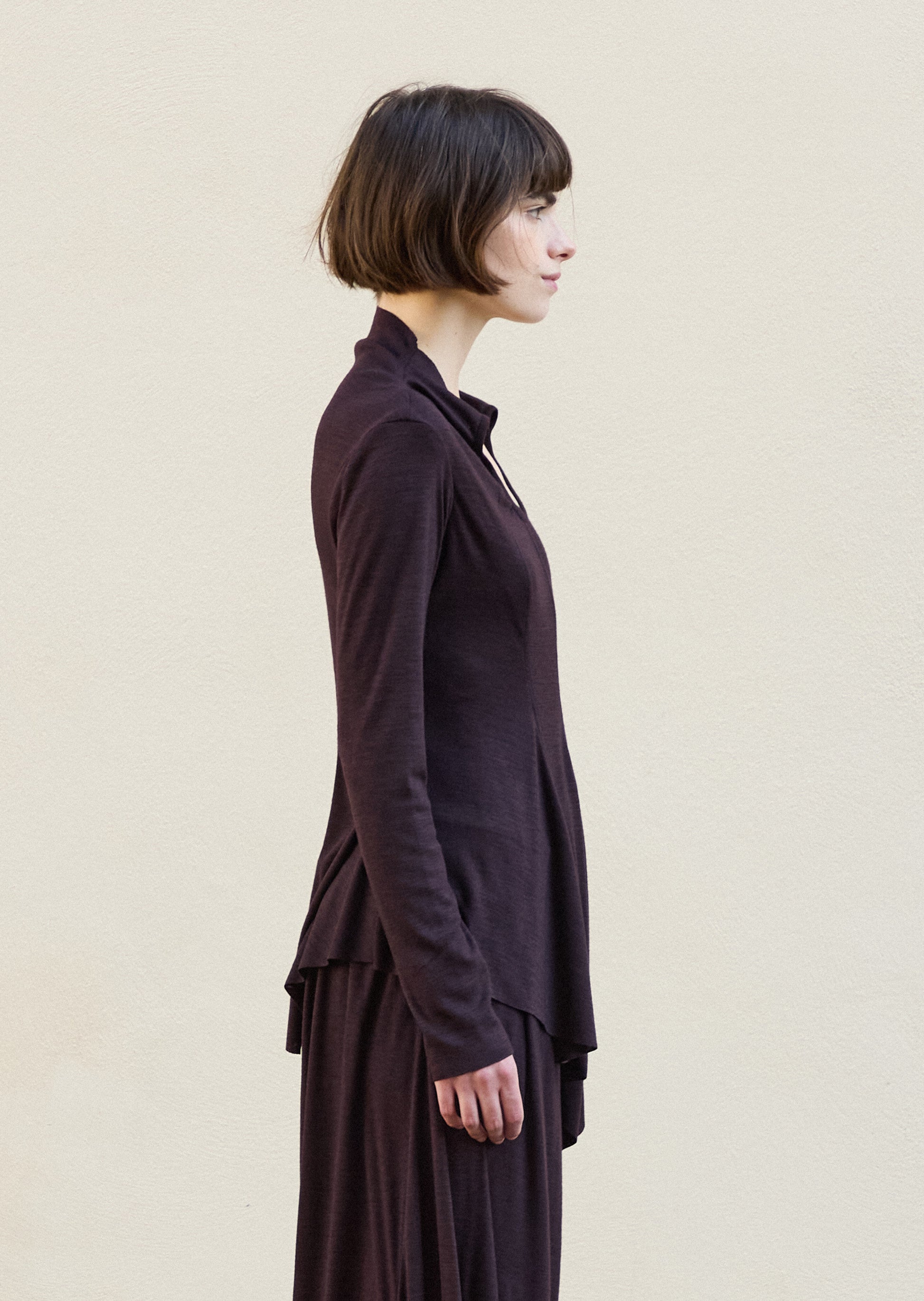 조각적인 곡선의 컷아웃 디테일이 있는 독특한 네크라인의 긴팔 저지 탑 입니다.