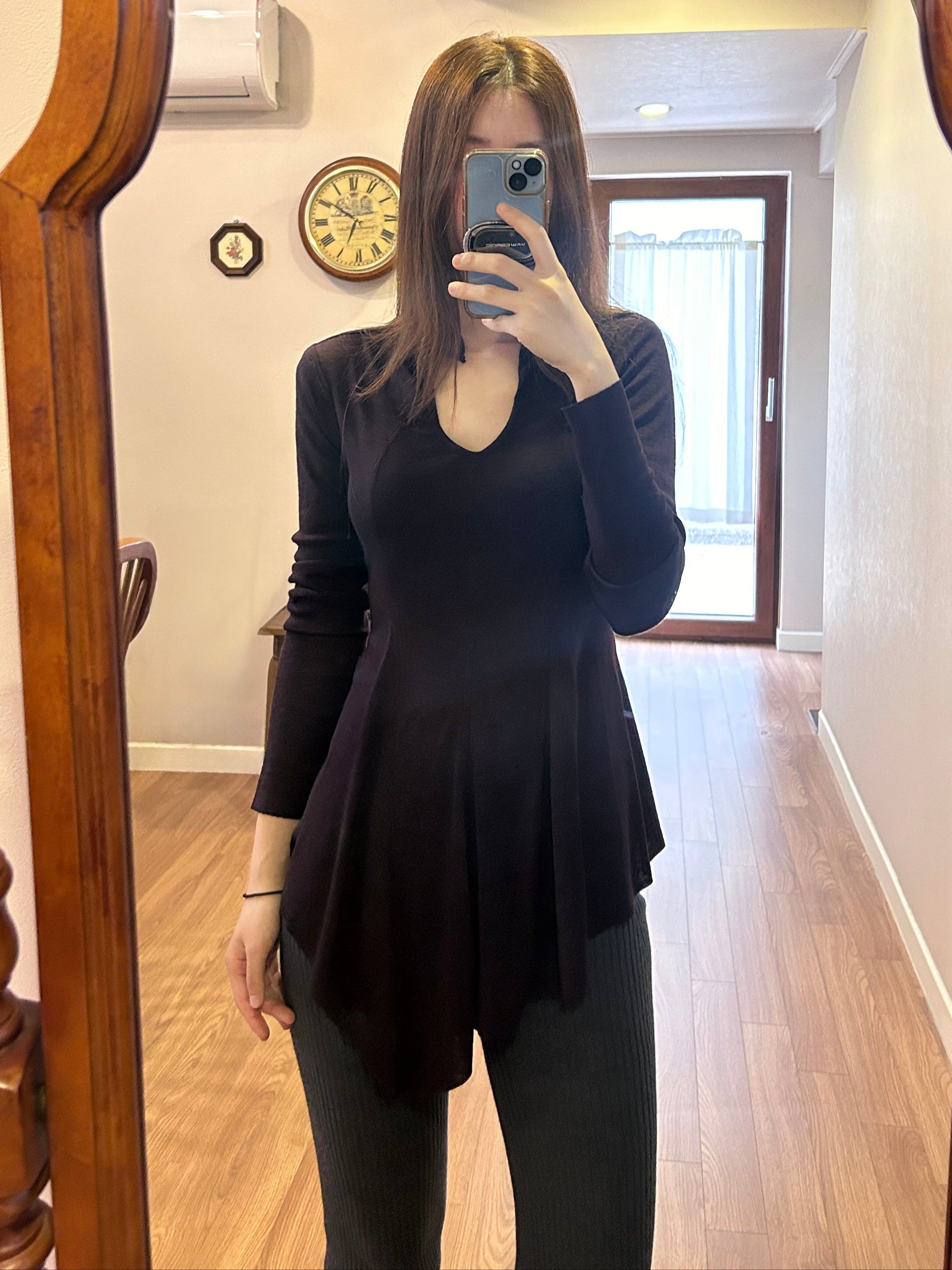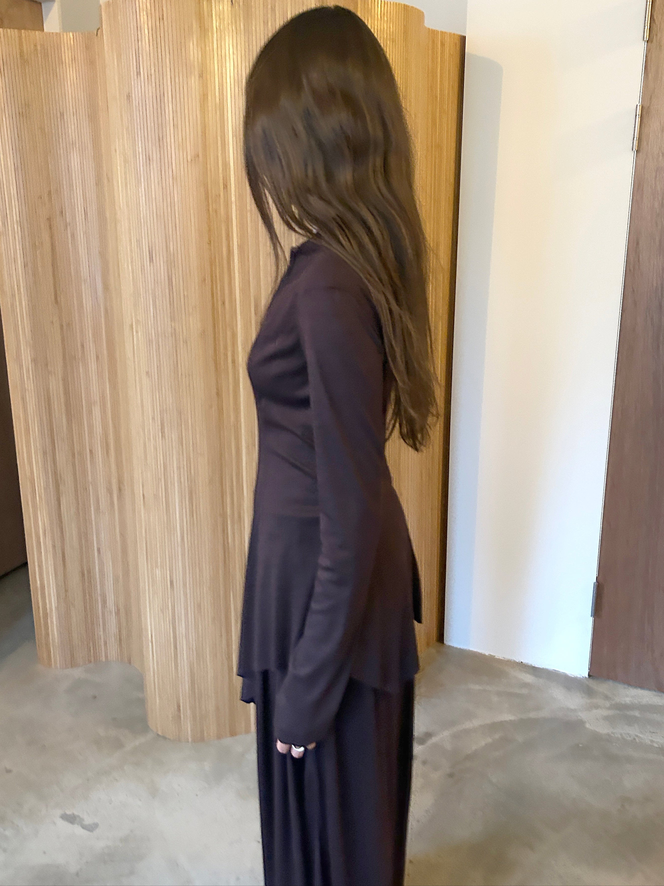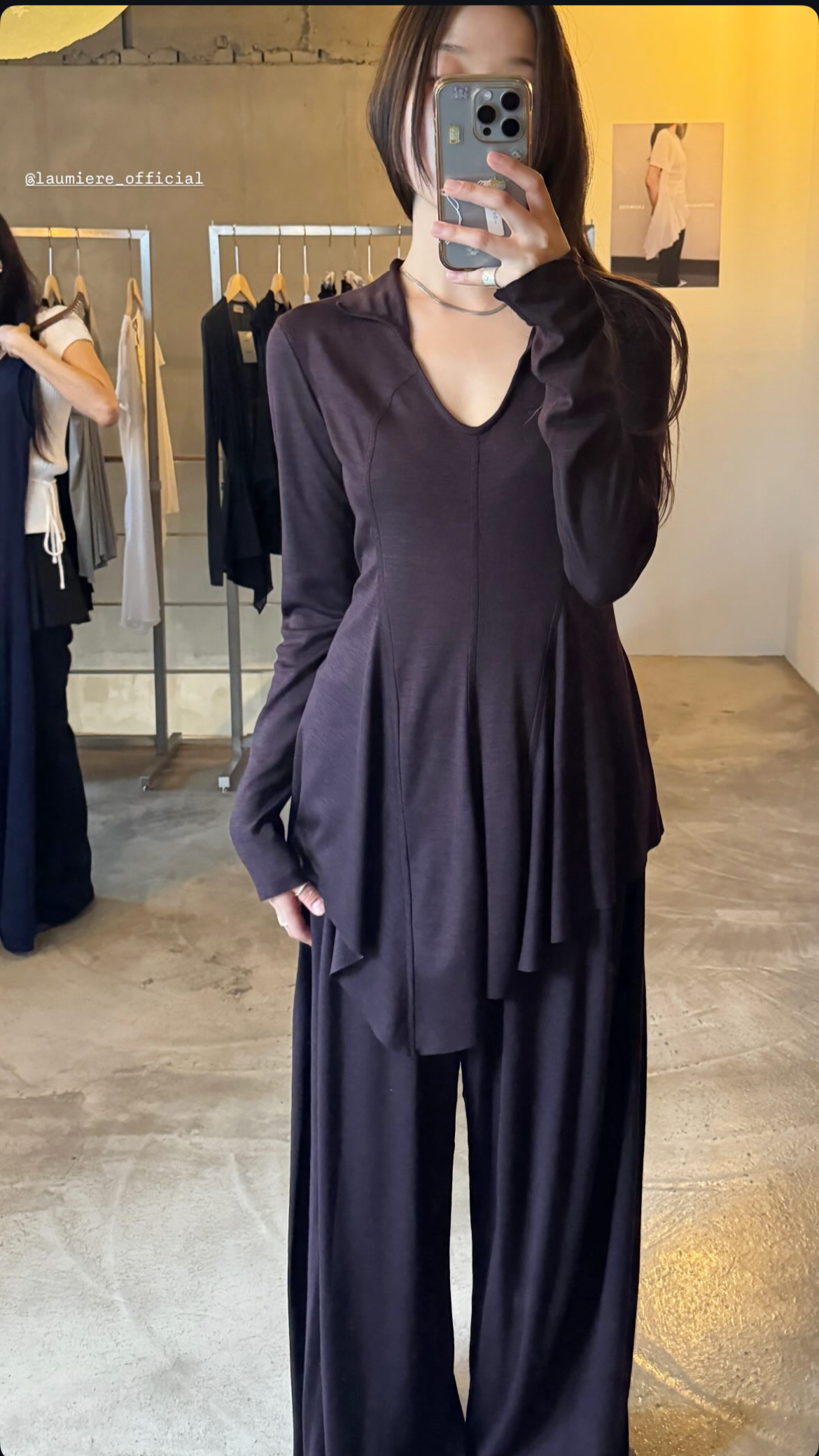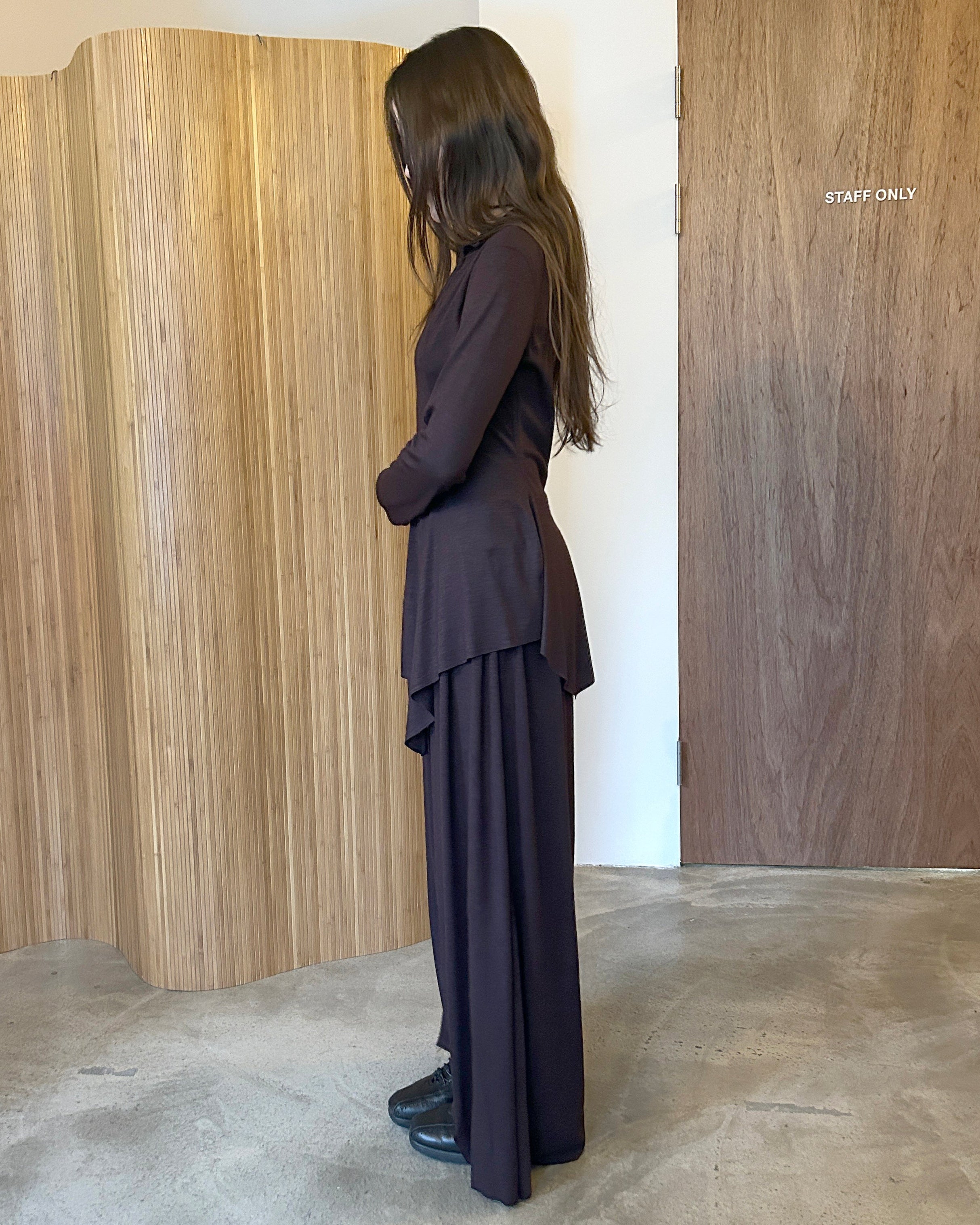 릴렉스하면서도 플루이드한 원단이 몸에 맞게 떨어지면서 은은하게 플레어 지며, 우아하지만 구조적인 실루엣을 완성합니다. 극도로 편안하면서도 자연스럽게 몸 위에 드레이프 되어, 착용자의 실루엣을 아름답게 강조합니다. 심 라인이 바디 곡선을 따라가며, 극도로 부드러운 촉감의 파인 저지 원단이 피부에 달라붙지 않고 매끄럽게 흐릅니다. 테일러드 팬츠부터 캐주얼한 하의까지 모두 잘 매치되는 데일리 아이템입니다.